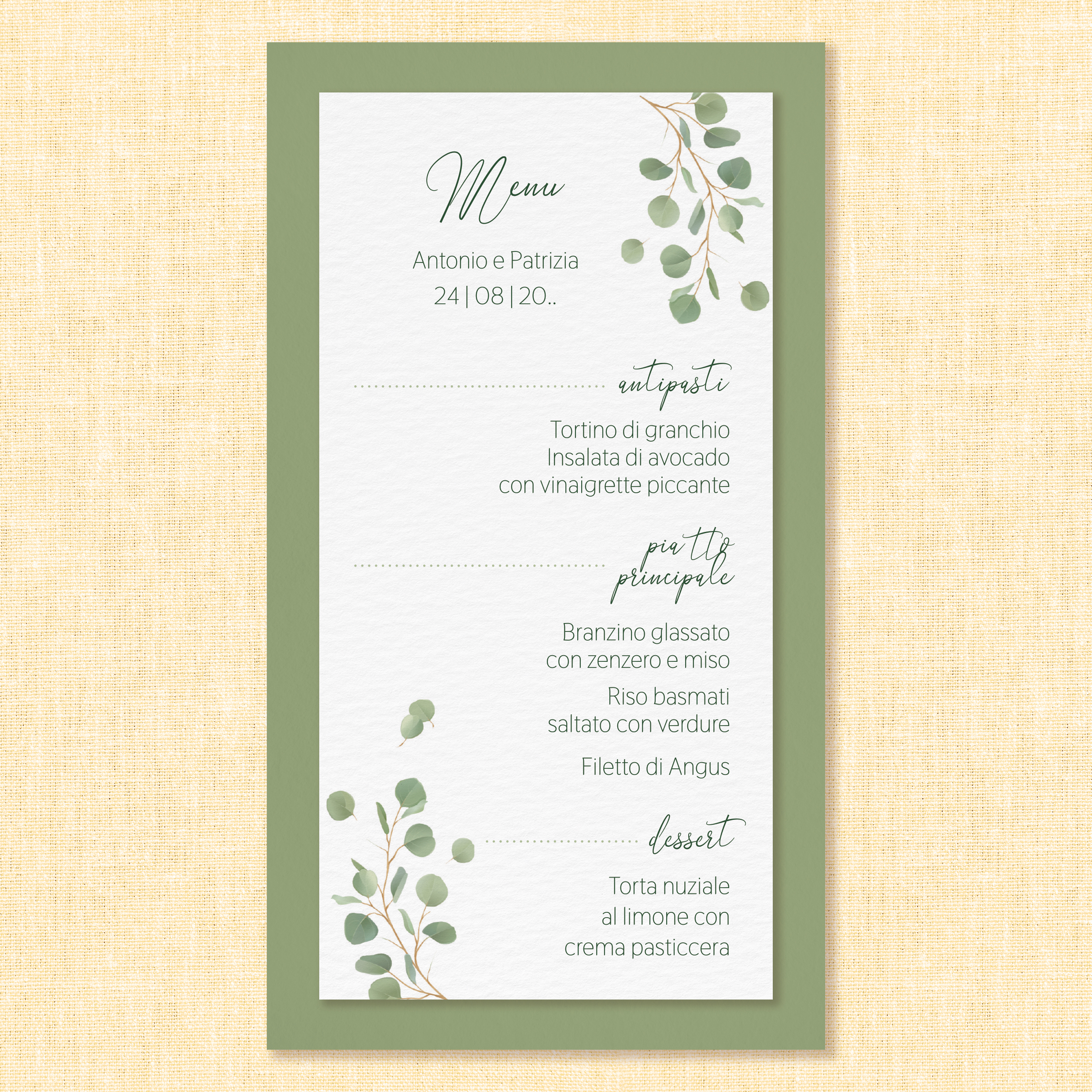 Il Menù di Matrimonio Orione è realizzato su cartoncino Modigliani Neve nel formato 21 x 10,5 cm, inserito in un elegante supporto cartaceo color verdigris che crea un raffinato effetto cornice. Il menù è impreziosito da delicate foglie di eucalipto stampate in digitale, che incorniciano le pietanze con uno stile naturale ed elegante.