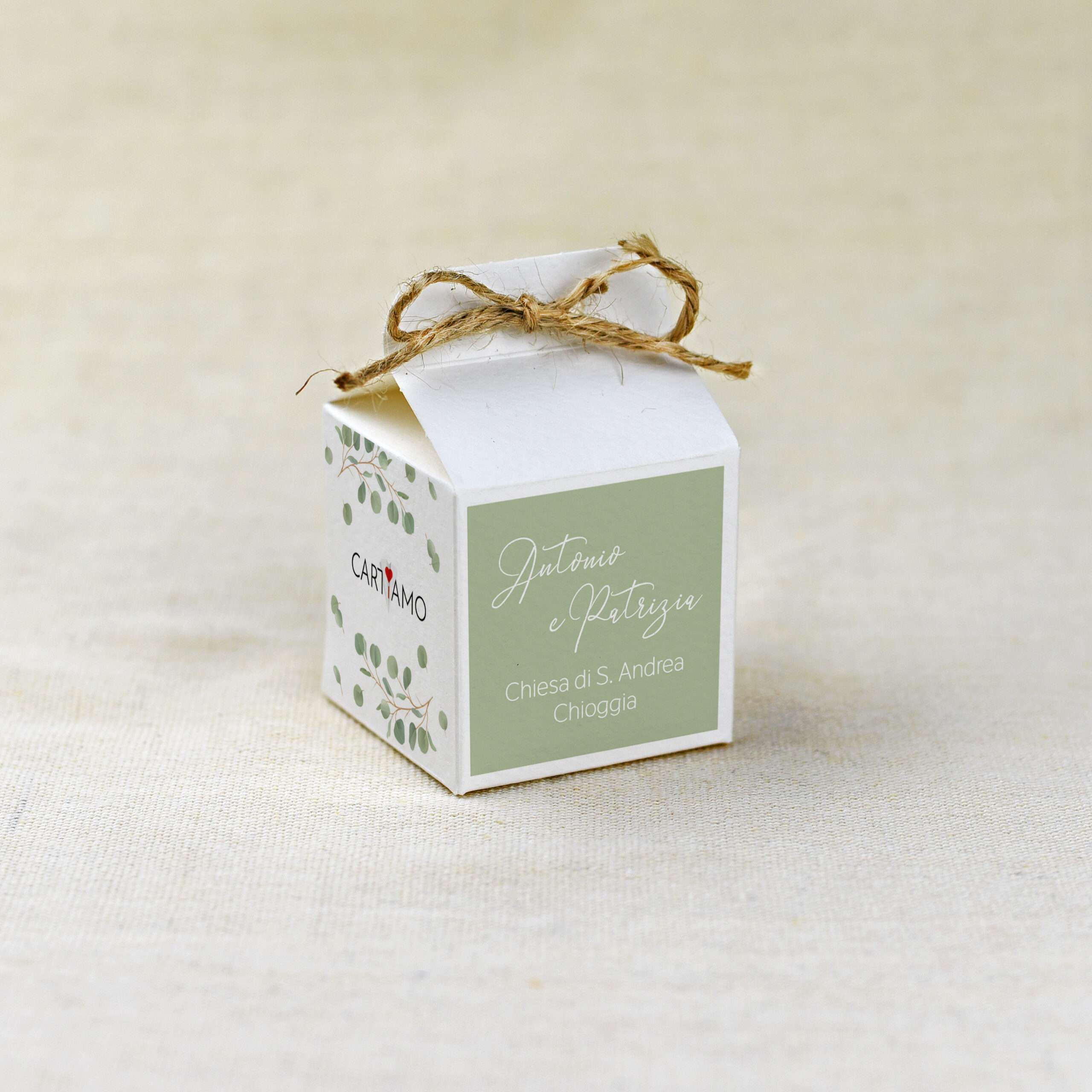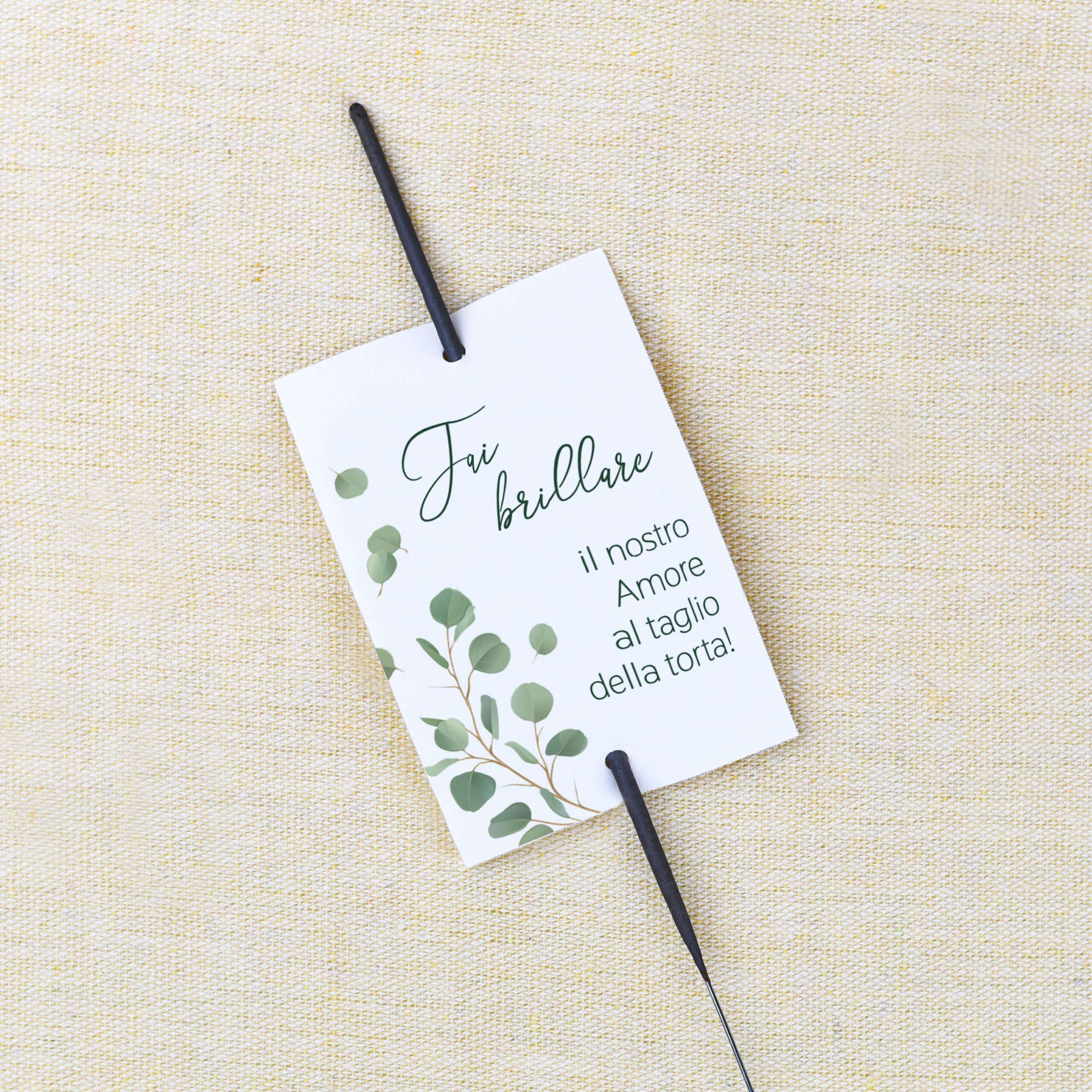 Il cartoncino è inserito in un supporto cartaceo color verdigris, che funge da cornice e dona profondità e contrasto al design, richiamando le tonalità botaniche del coordinato.