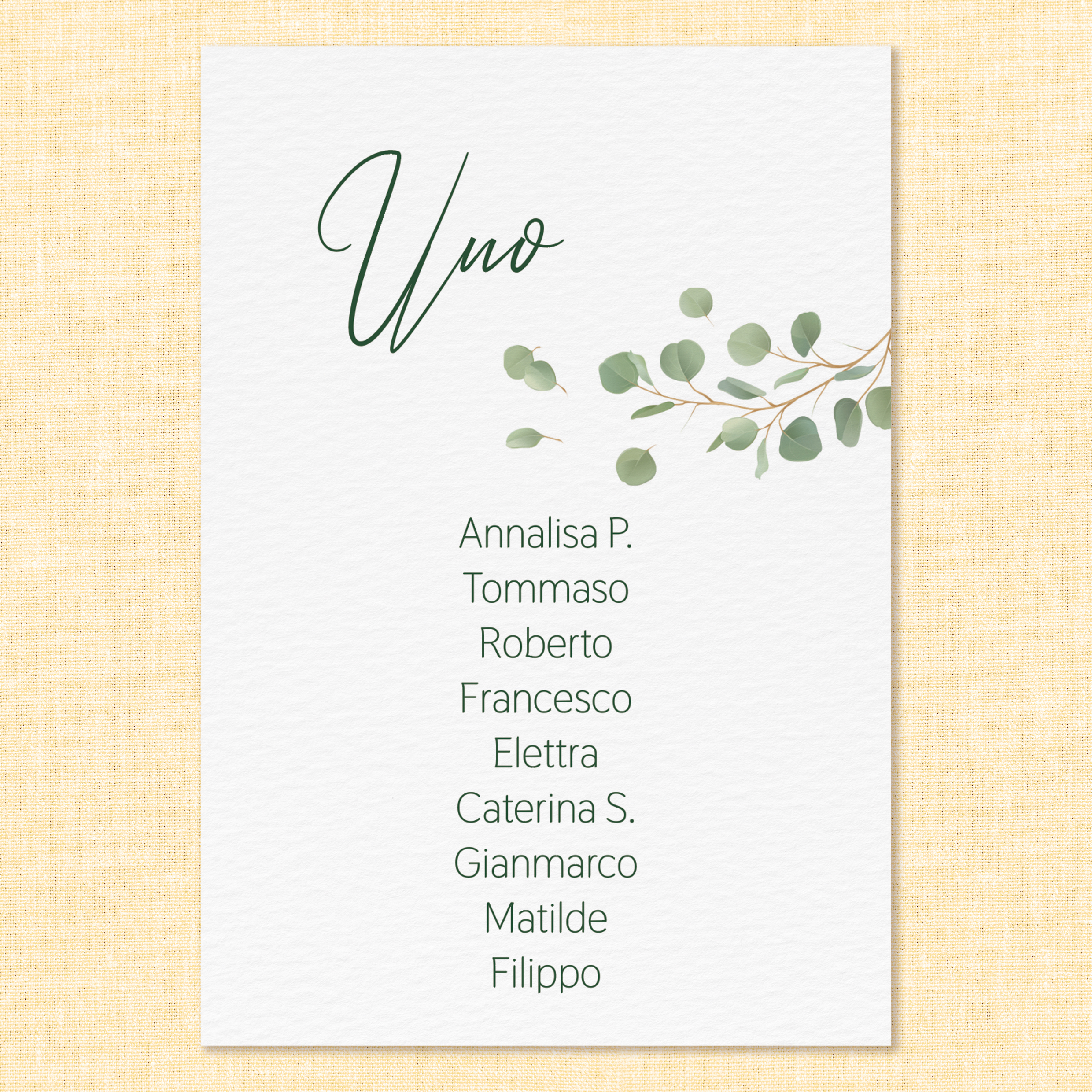 La grafica è arricchita da eleganti foglie di eucalipto, che incorniciano le pietanze con delicatezza e leggerezza, accompagnando lo sguardo lungo il menù e valorizzando ogni portata. Un dettaglio botanico che rende il menù raffinato e senza tempo, perfetto per matrimoni dallo stile naturale ma ricercato.
