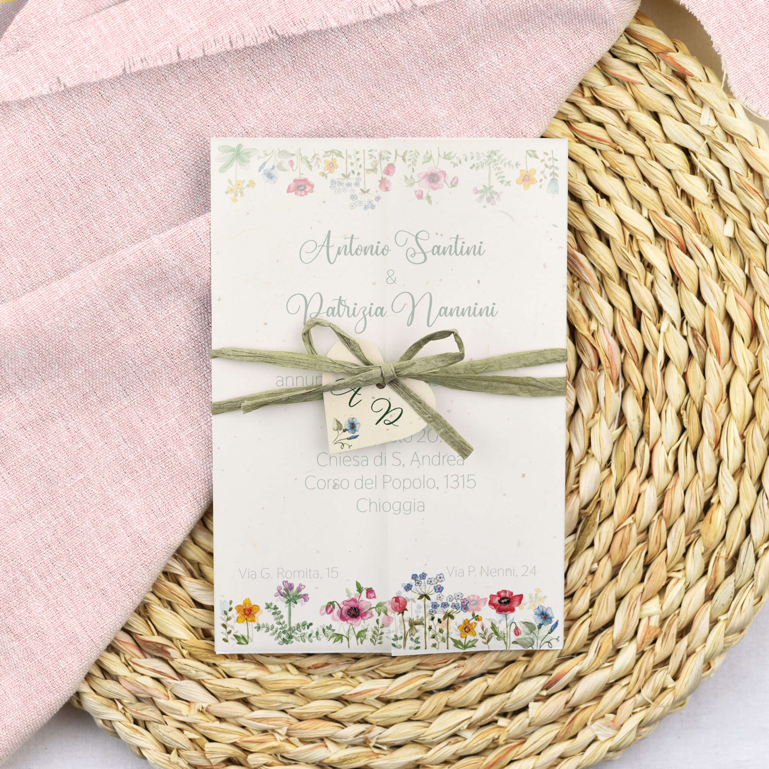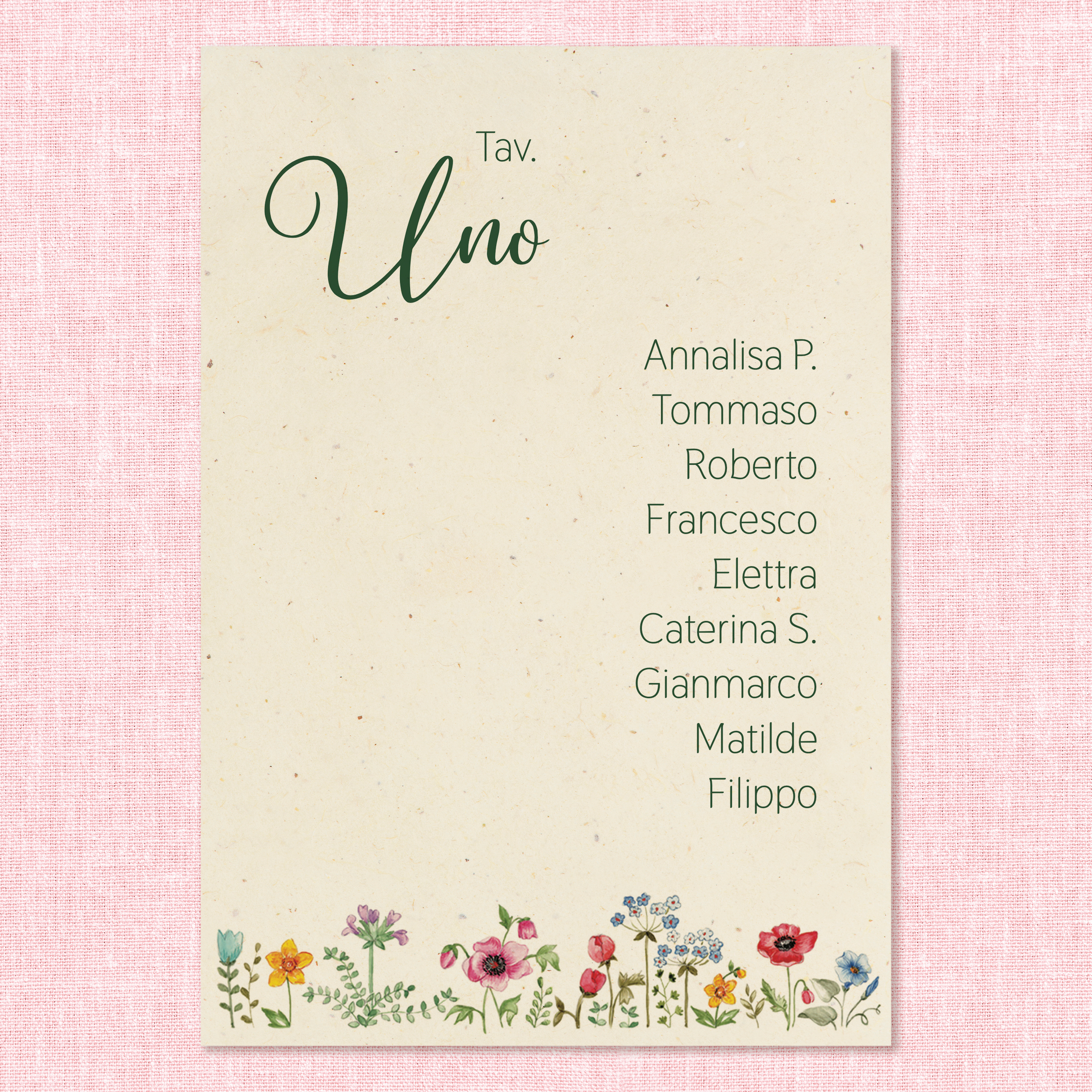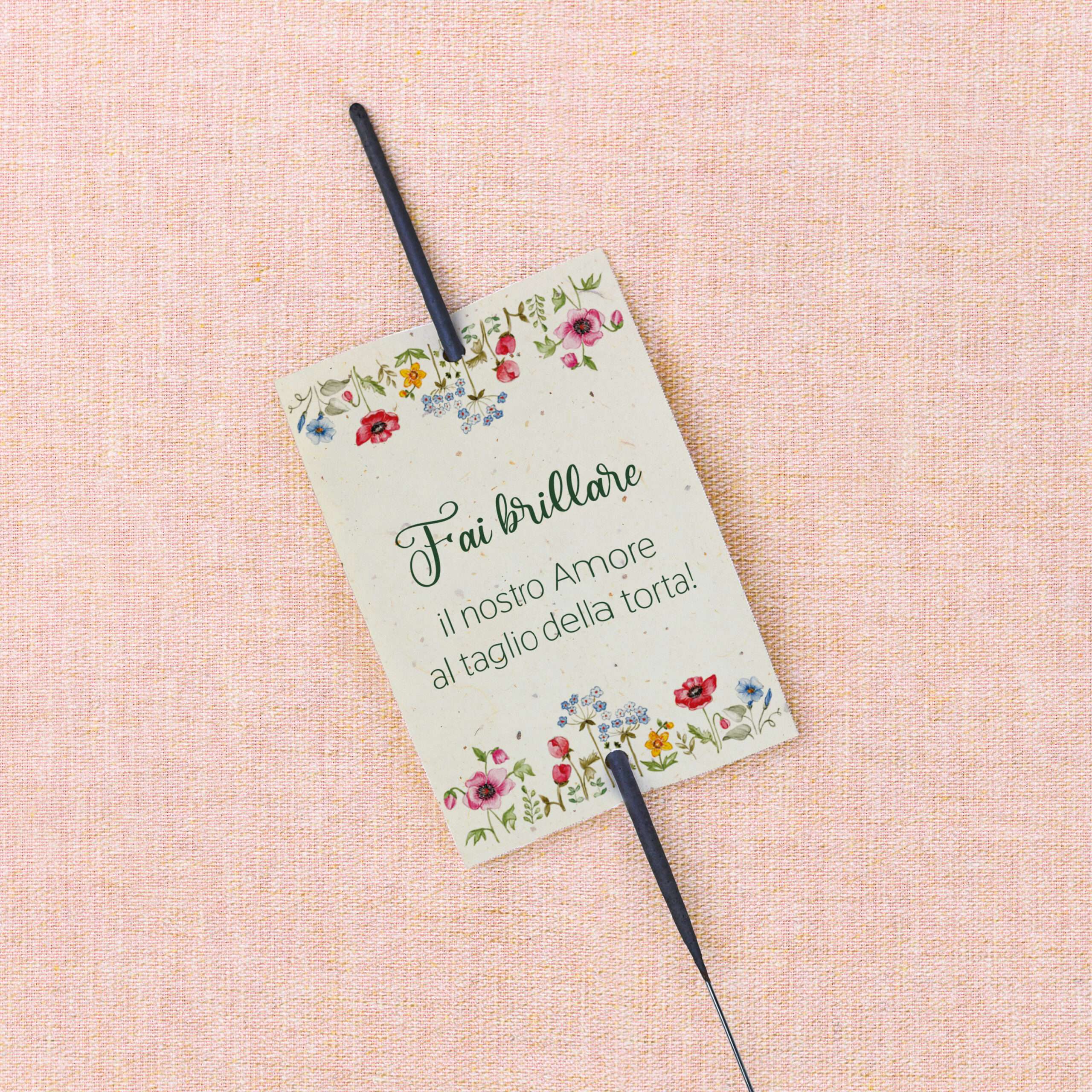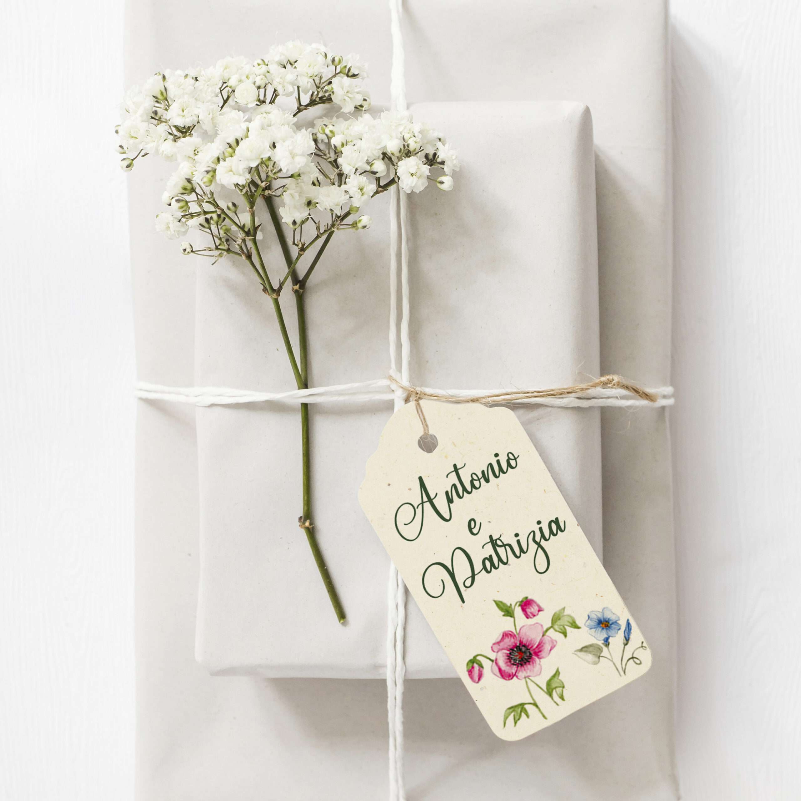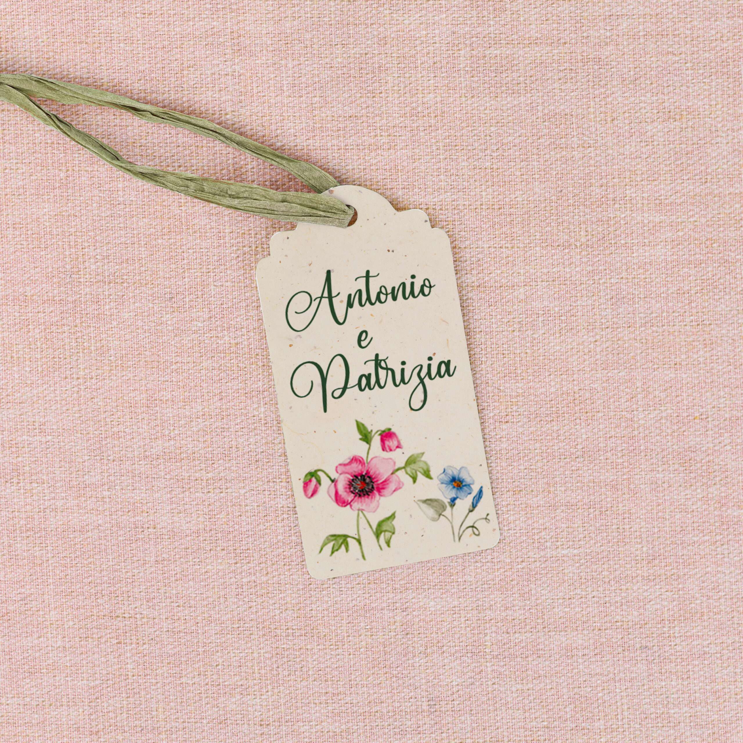 Stampato in digitale su cartoncino liscio Woodstock Betulla 225 gr, il tag unisce qualità e solidità, valorizzando la grafica botanica. I delicati fiorellini di campo colorati incorniciano con armonia i nomi degli sposi e la data del matrimonio, trasformando ogni tag in un piccolo dettaglio coordinato e memorabile.