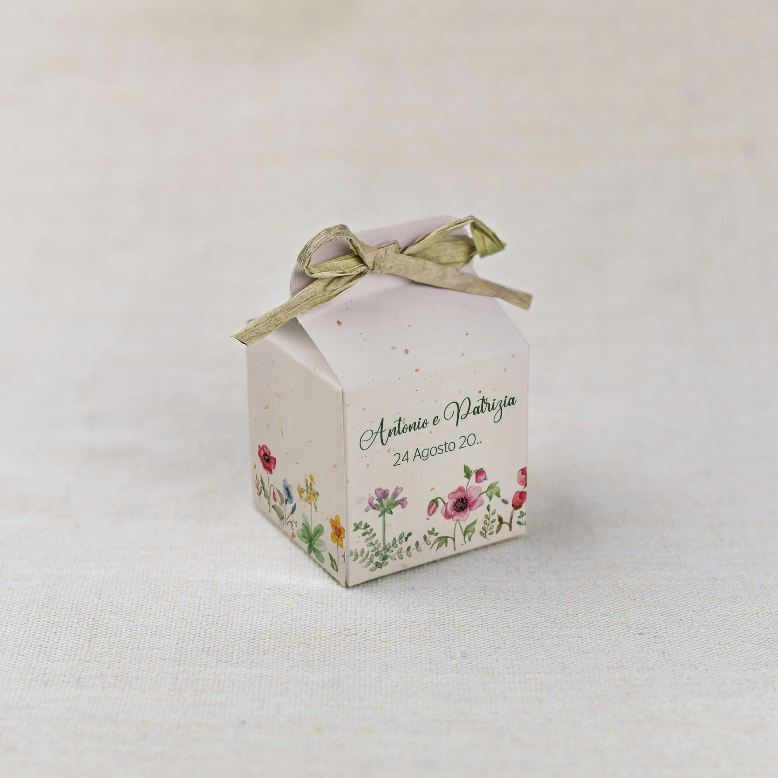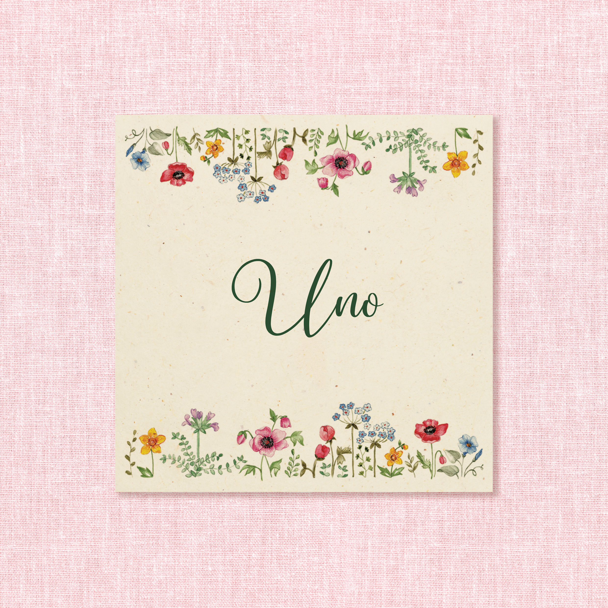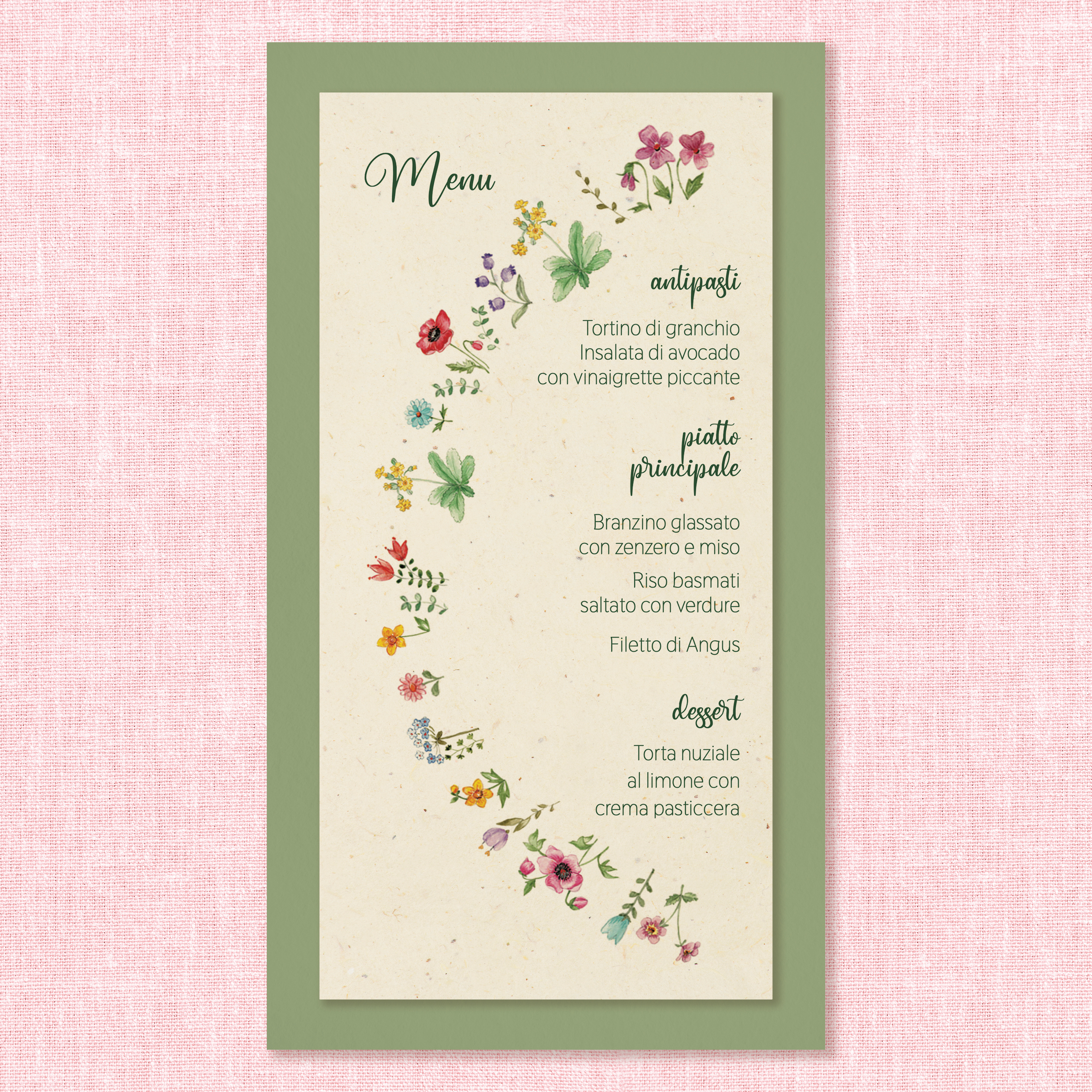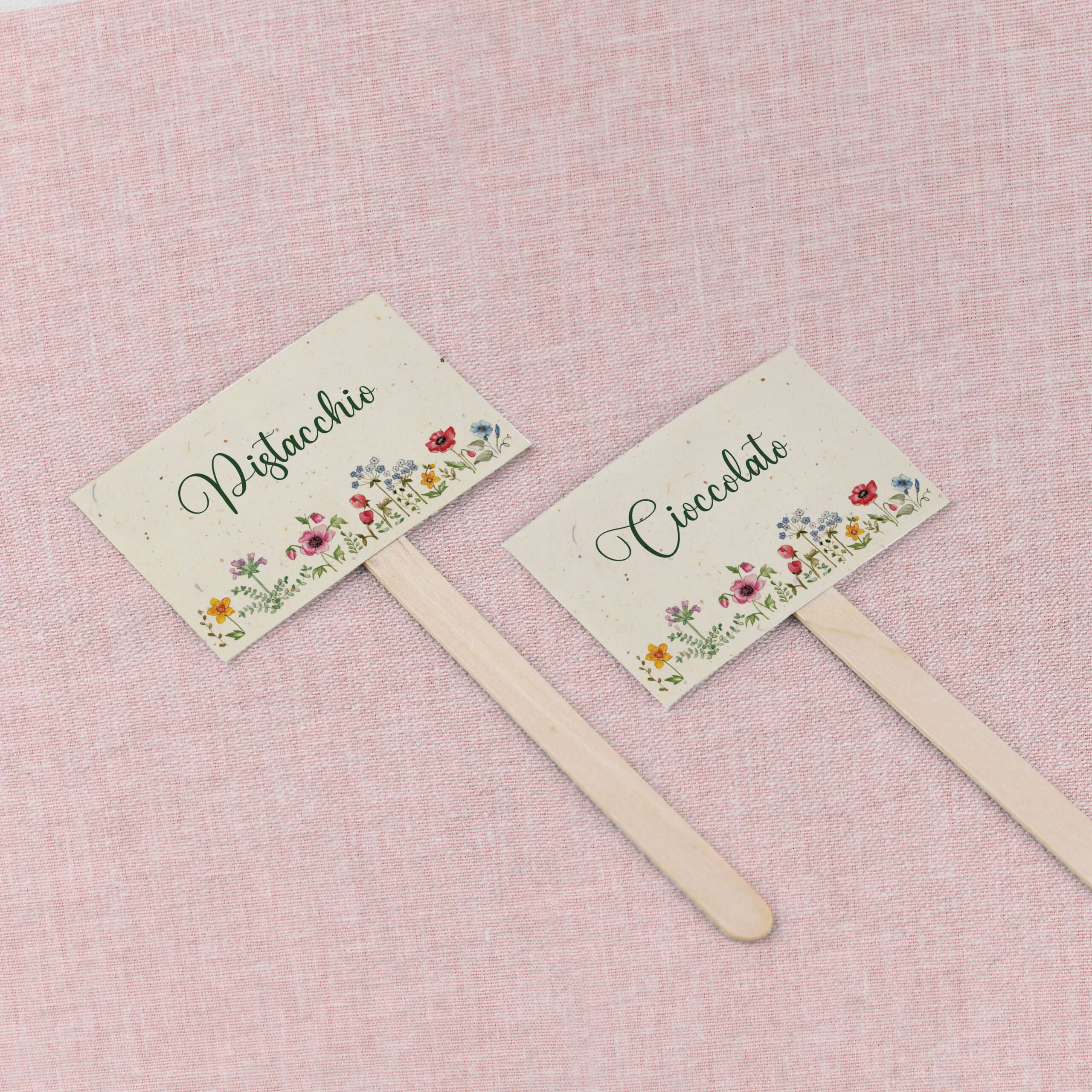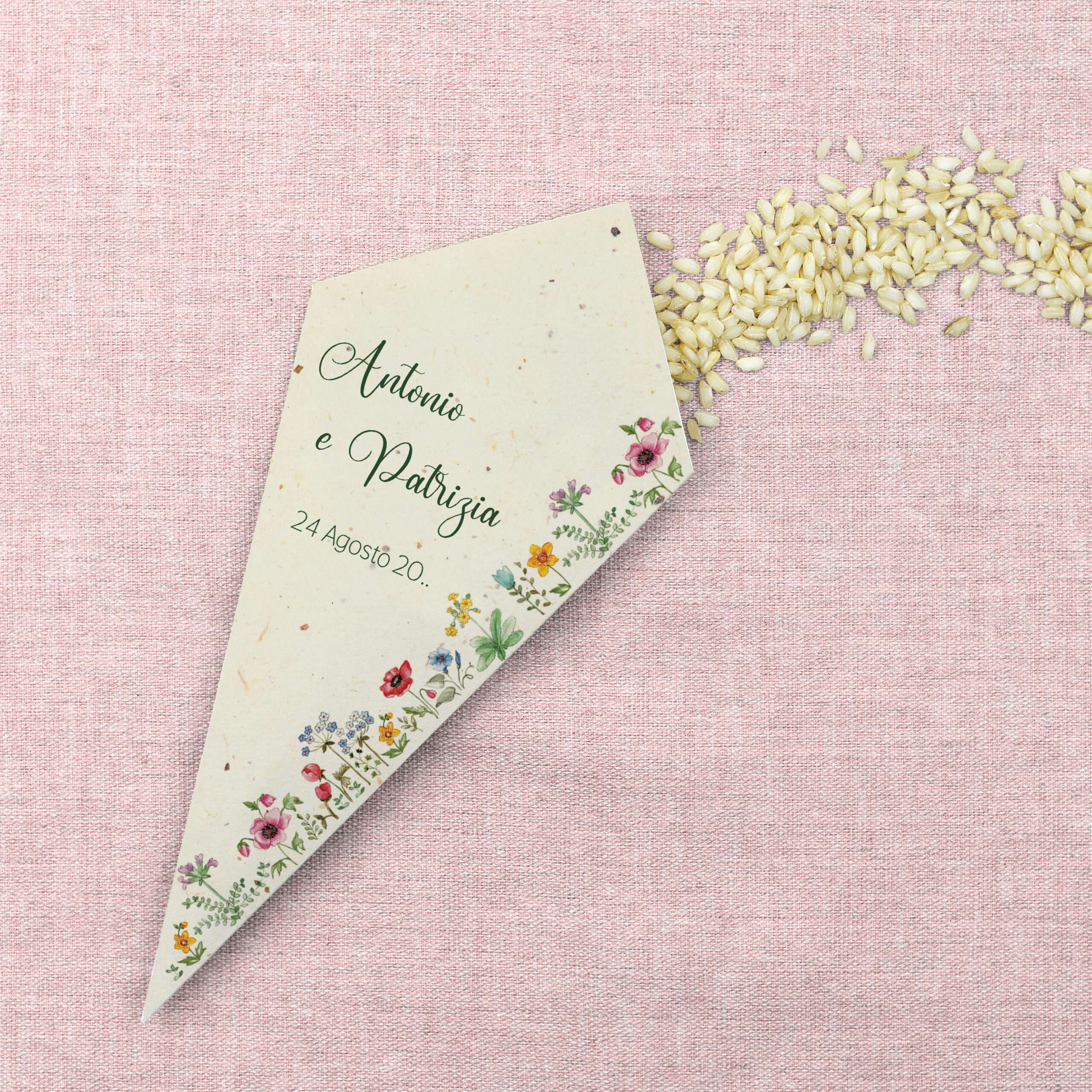Stampato in digitale su cartoncino liscio Woodstock Betulla 225 gr, il tag unisce qualità e solidità, valorizzando la grafica botanica. I delicati fiorellini di campo colorati incorniciano con armonia i nomi degli sposi e la data del matrimonio, trasformando ogni tag in un piccolo dettaglio coordinato e memorabile.