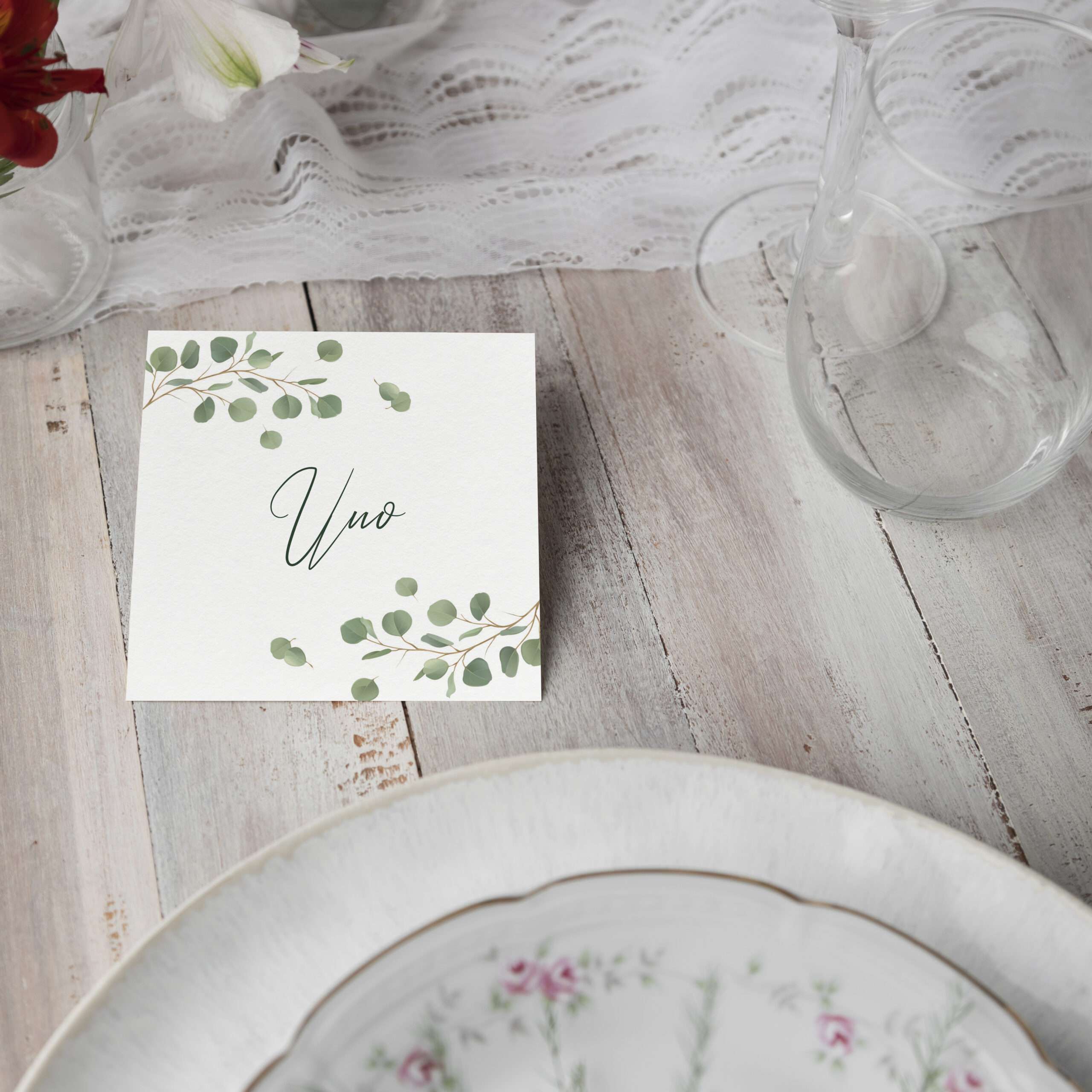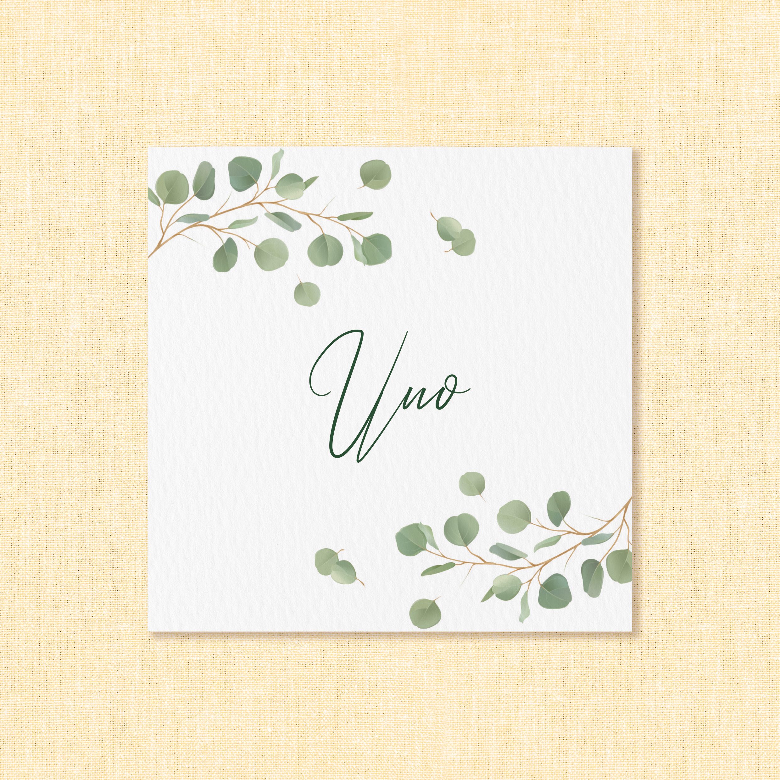 La grafica è caratterizzata da delicate foglie di eucalipto, che incorniciano con armonia il nome o il numero del tavolo, rendendo immediata la lettura e contribuendo a creare una mise en place ordinata e curata nei minimi dettagli. Il motivo botanico richiama i toni naturali del coordinato, integrandosi perfettamente con fiori, centrotavola e decorazioni verdi.