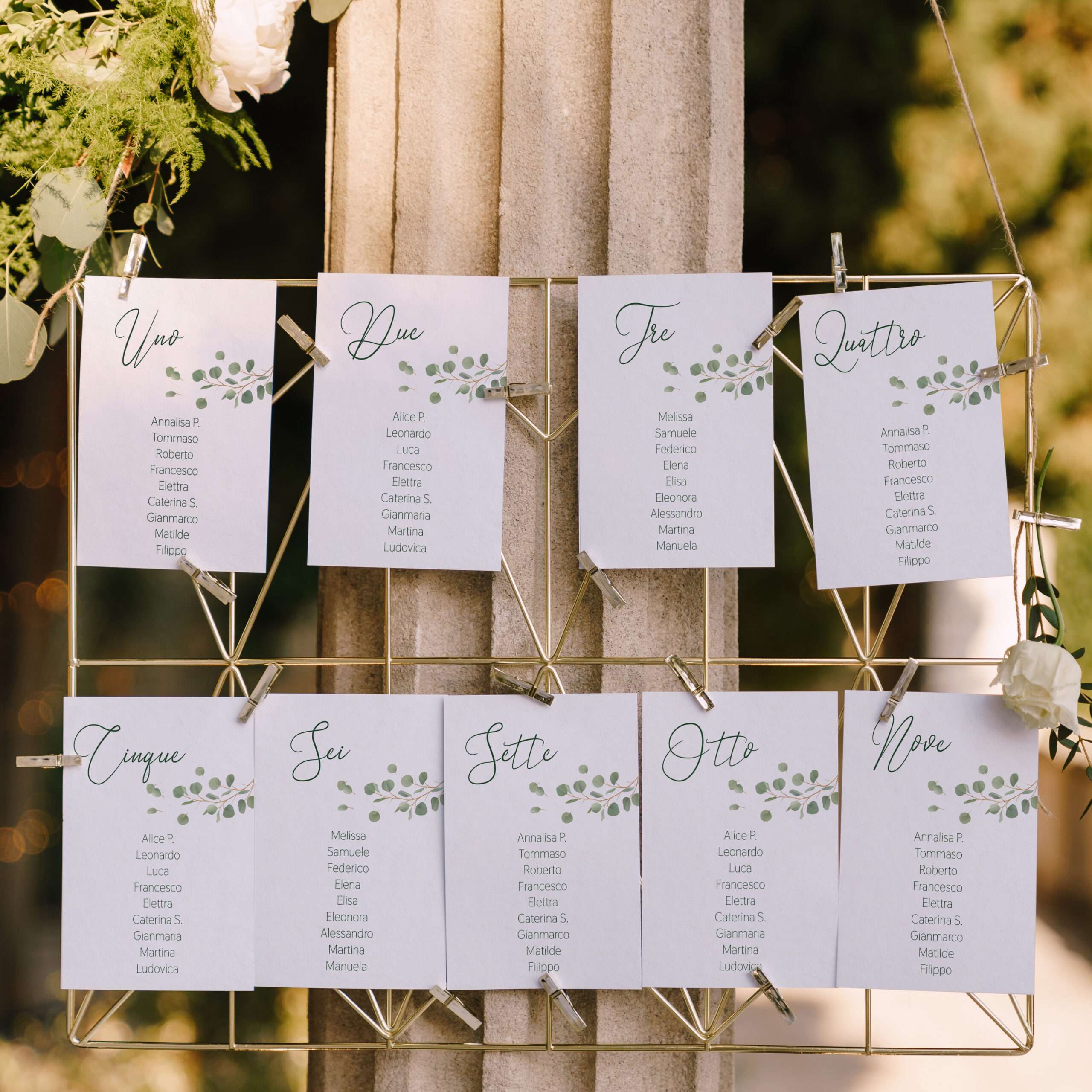 La grafica è caratterizzata da delicate foglie di eucalipto, che incorniciano con armonia il nome del tavolo e i nomi degli invitati, creando una composizione equilibrata, ordinata e di grande impatto visivo. Il motivo botanico richiama i valori di naturalezza ed eleganza, rendendo il cartoncino adatto a molteplici interpretazioni creative.