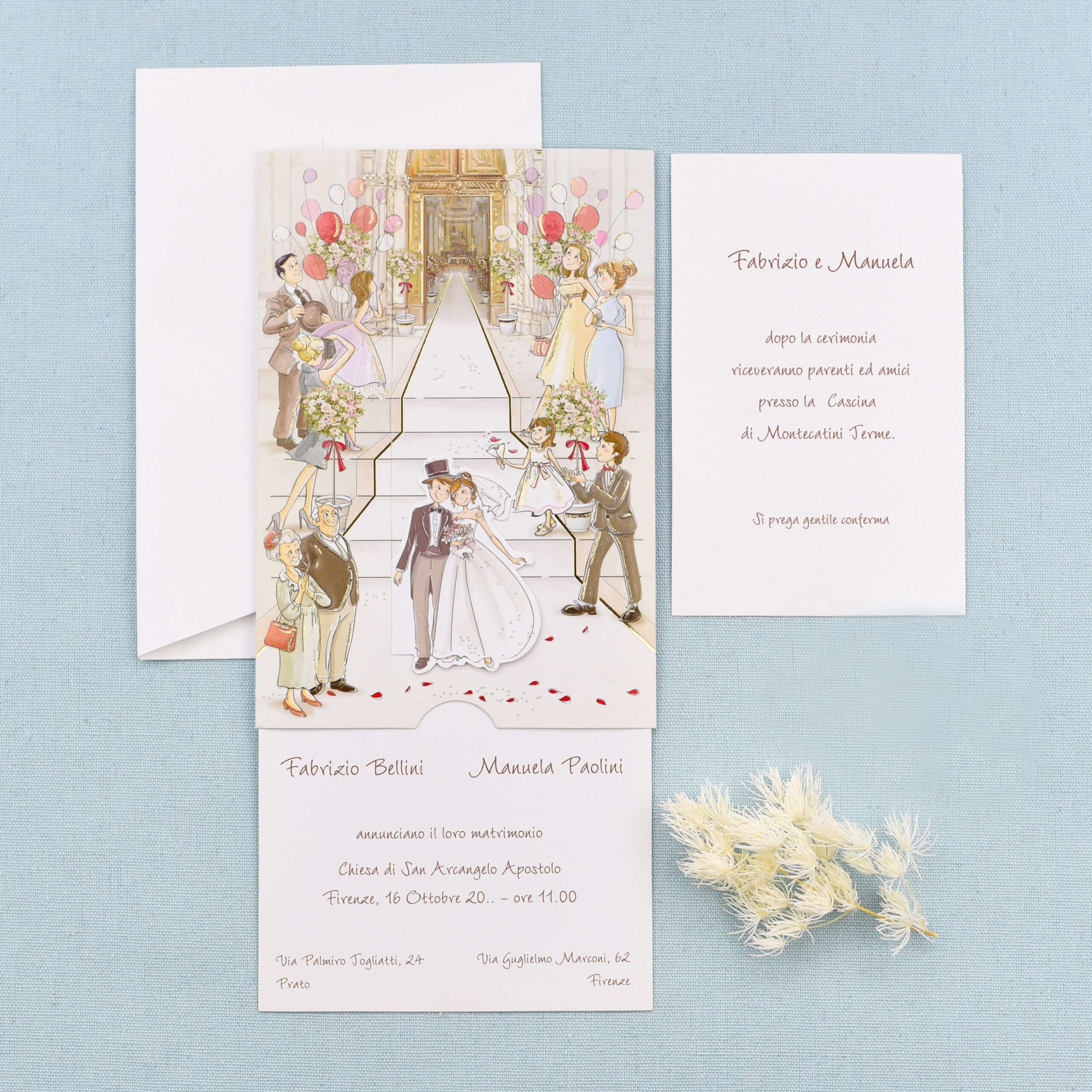 Il dettaglio più sorprendente è la sua struttura interattiva: grazie a una piccola asola posta nella parte inferiore, è possibile far scorrere i due sposi verso il basso, svelando così il cartoncino interno con l’invito alla cerimonia. Un gesto semplice e divertente che renderà ogni partecipazione un piccolo ricordo da conservare.