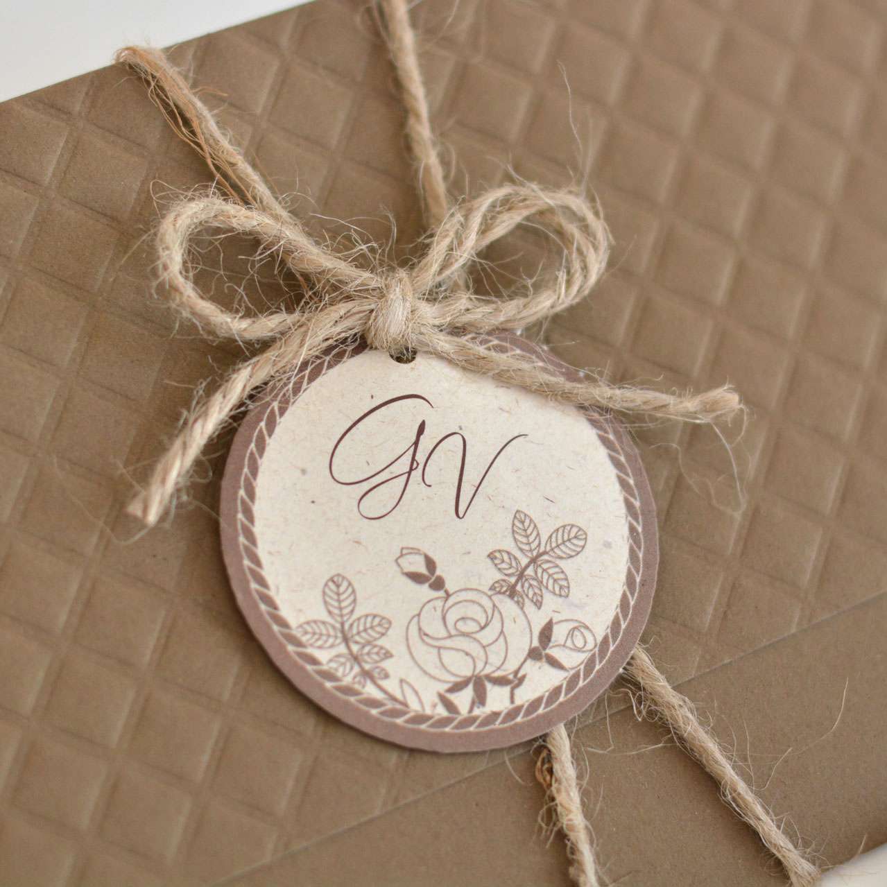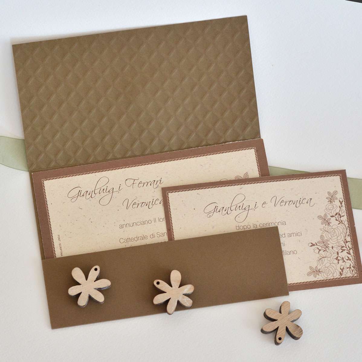 L’insieme è impreziosito da un cordino rustico naturale, che avvolge la partecipazione e trattiene un’elegante applicazione tonda stampata con grafica botanica in stampa litografica marrone, coordinata ai toni caldi del nocciola e alle decorazioni interne raffiguranti delicate foglie.