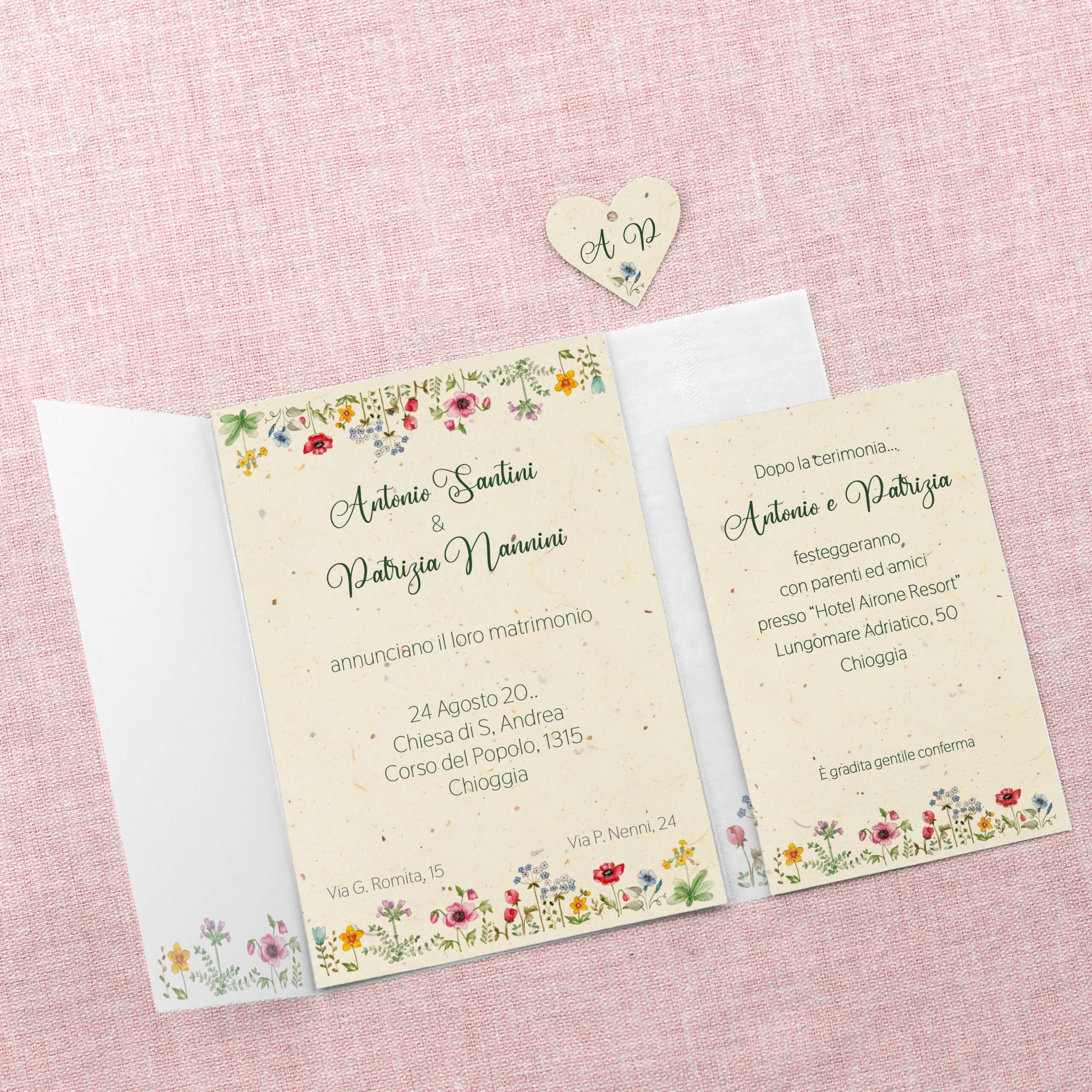 Il design è caratterizzato da un elegante disegno di fiorellini di campo colorati, un motivo che dona alla partecipazione un’estetica fresca, romantica e senza tempo.