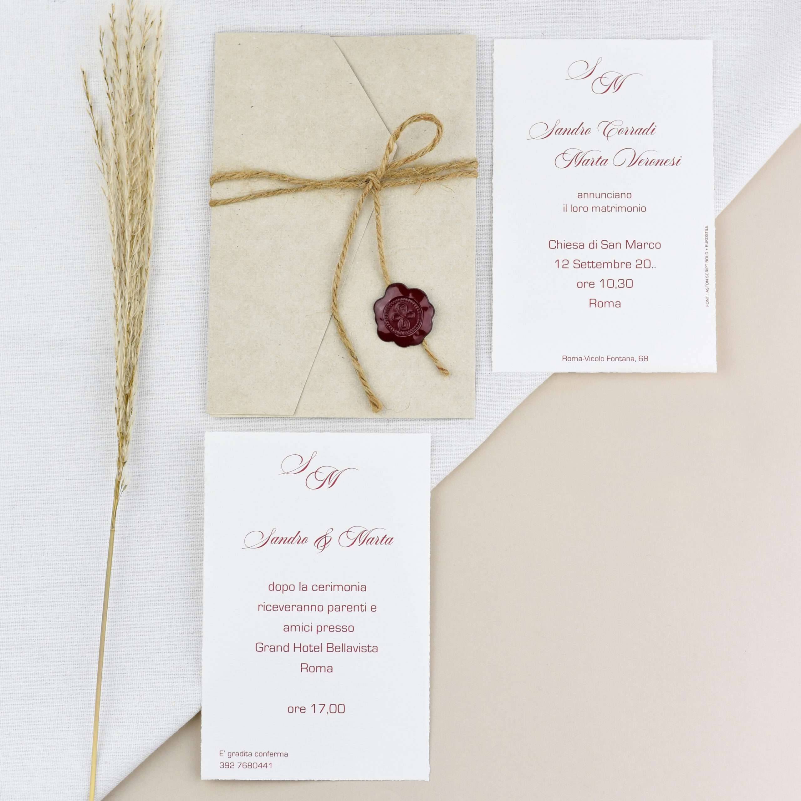 Un’applicazione a forma di ceralacca bordeaux impreziosisce il fronte della partecipazione, aggiungendo un tocco di raffinatezza senza tempo.