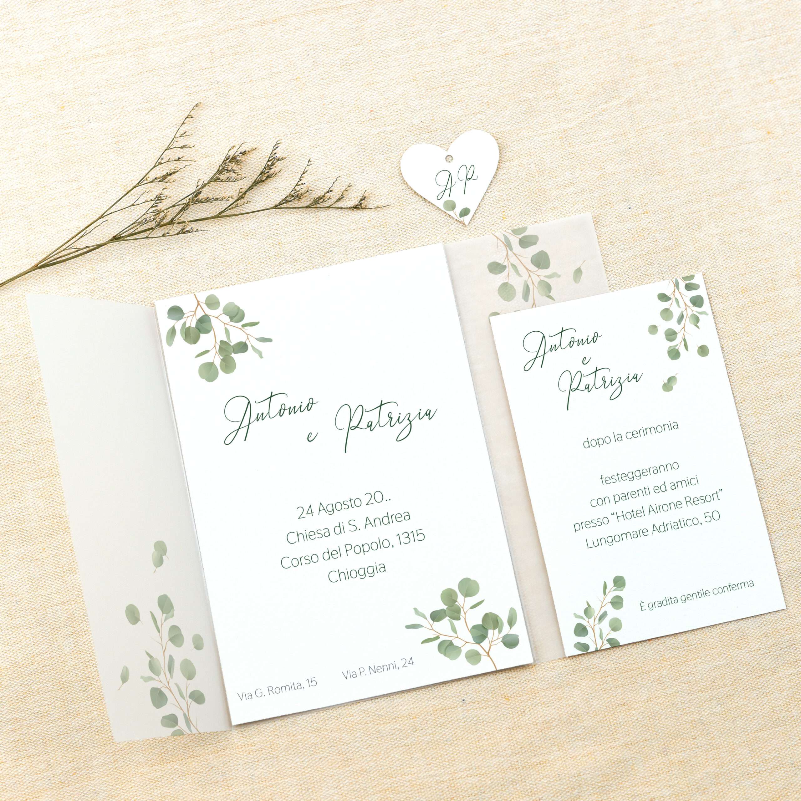 Il design è caratterizzato da un elegante disegno di foglie di eucalipto, elemento botanico molto amato per la sua delicatezza e il suo significato di armonia, rinascita e amore duraturo. Un motivo che dona alla partecipazione un’estetica fresca, romantica e senza tempo.