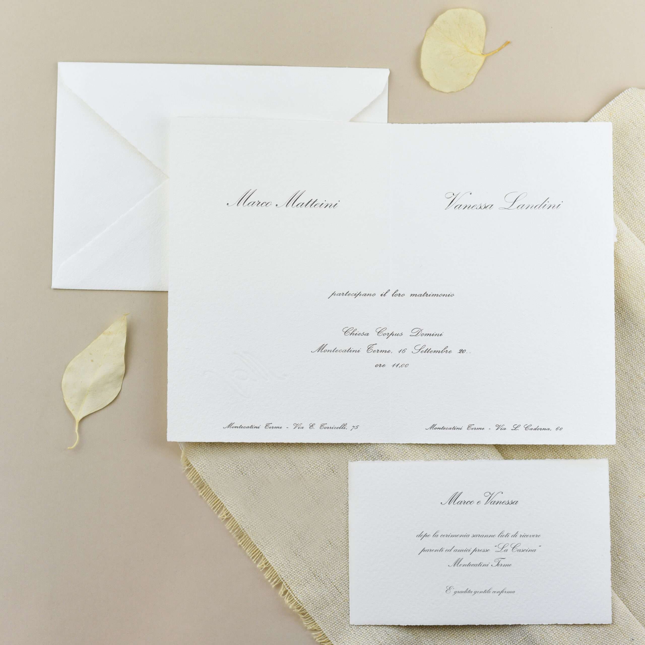 Vittoria è una partecipazione di nozze dal carattere classico e intramontabile, pensata per chi ama il gusto tradizionale unito a materiali di qualità.