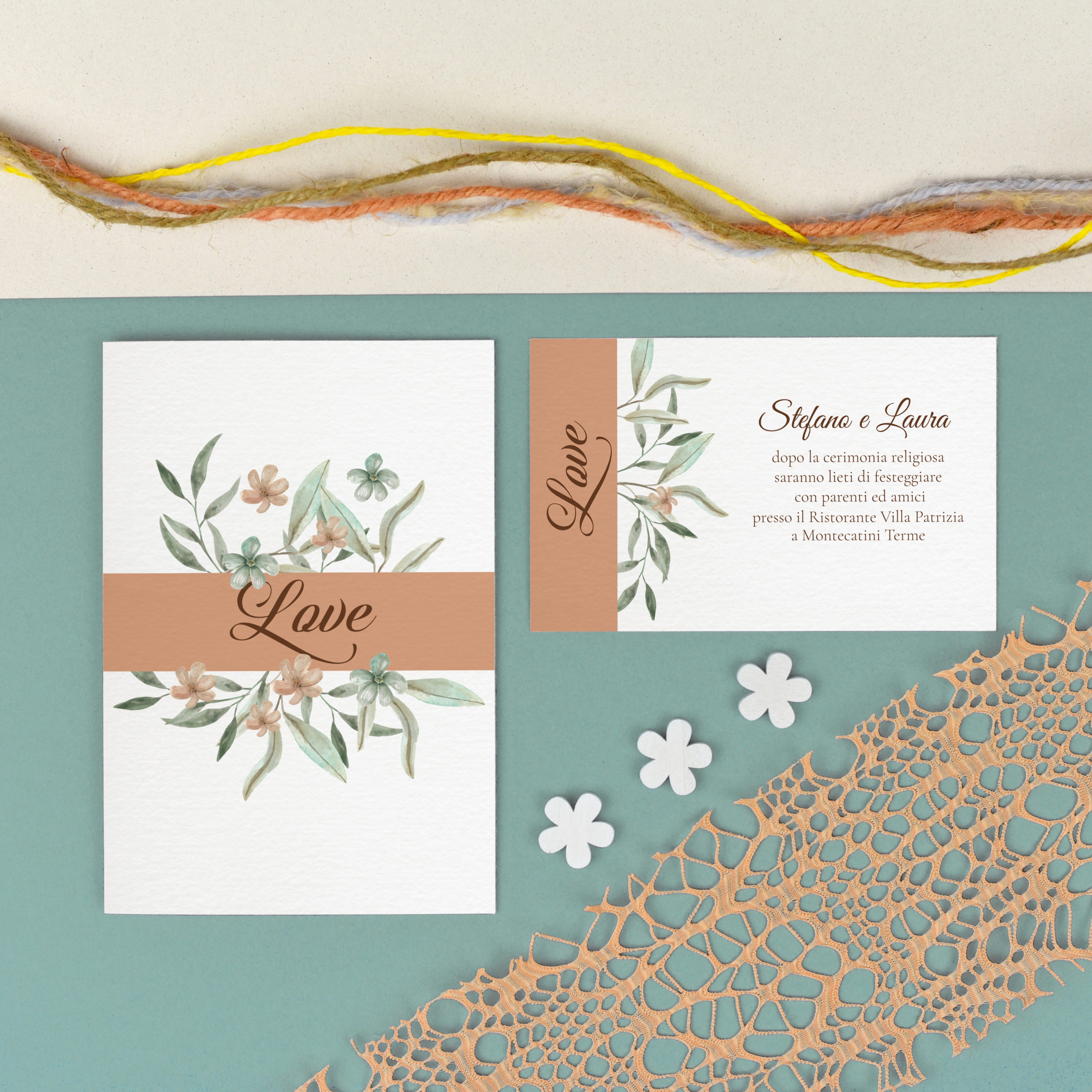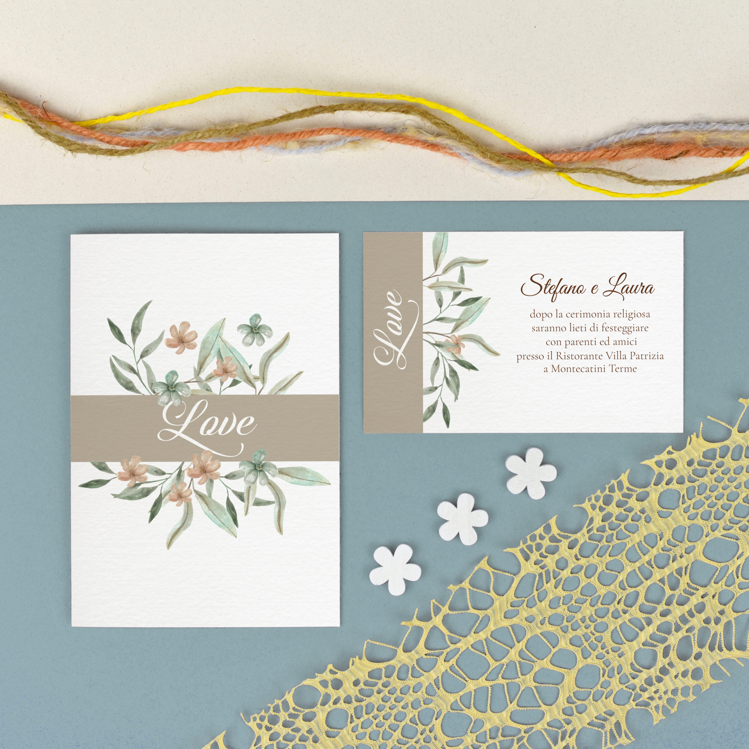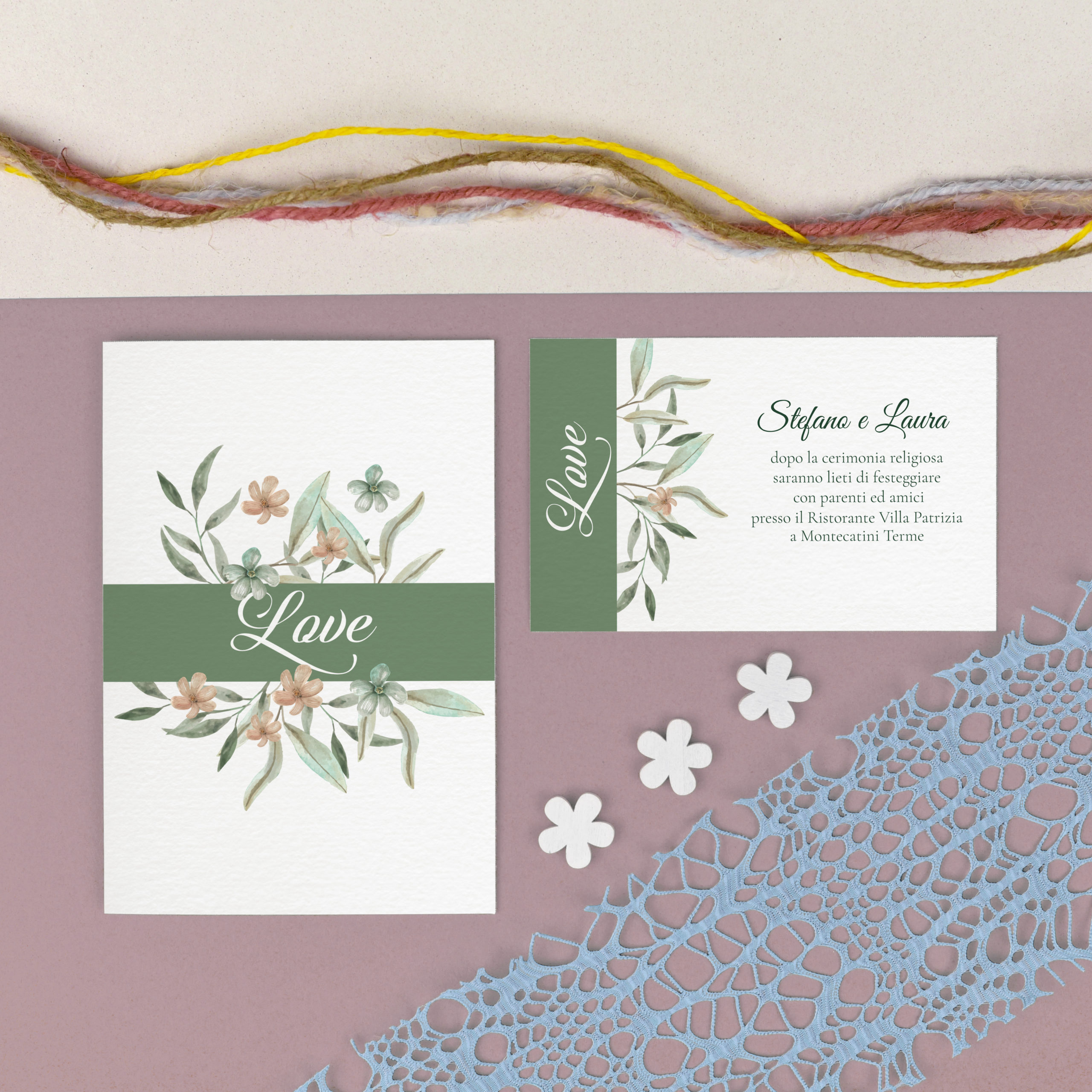 Partecipazione in stile floreale realizzato su pregiato supporto cartaceo bianco goffrato Natural Evolution White 200 gr.
