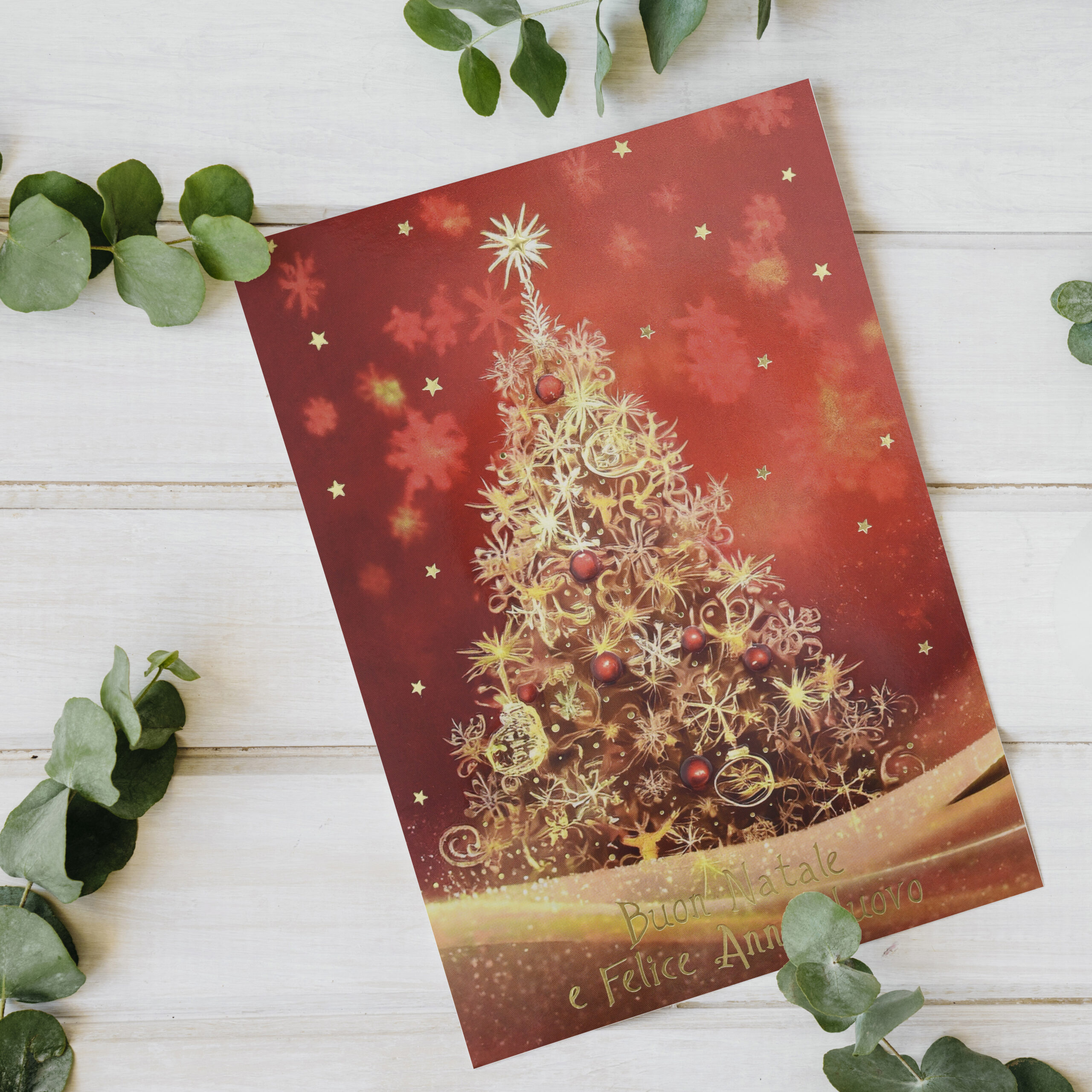 Biglietto di Natale lucido con stampa a colori e decorazioni in oro a caldo e rilievo. Busta bianca inclusa.