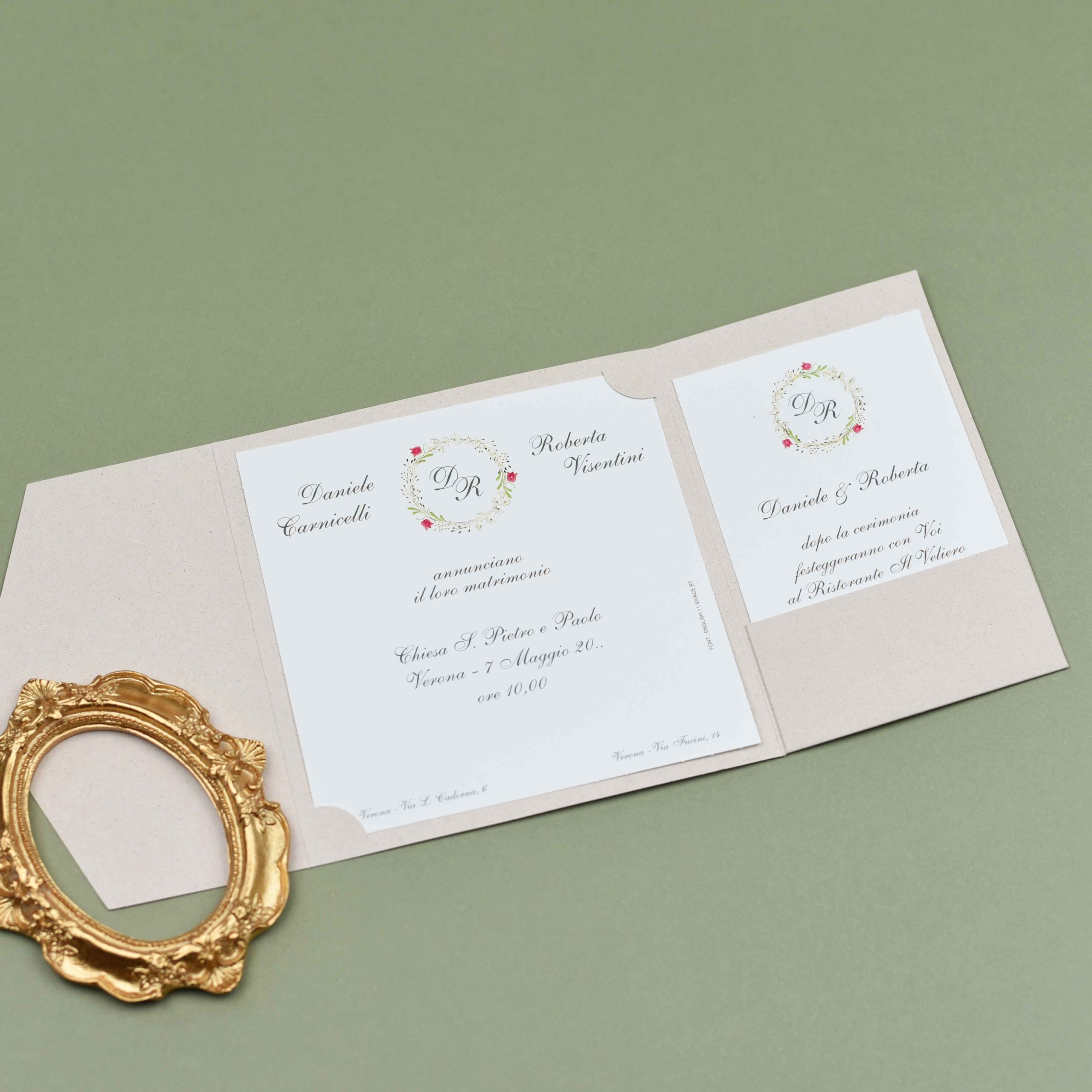La Partecipazione è composta da: Invito alla cerimonia, Invito al ristorante e talloncino tondo che servirà a chiudere il vostro biglietto.