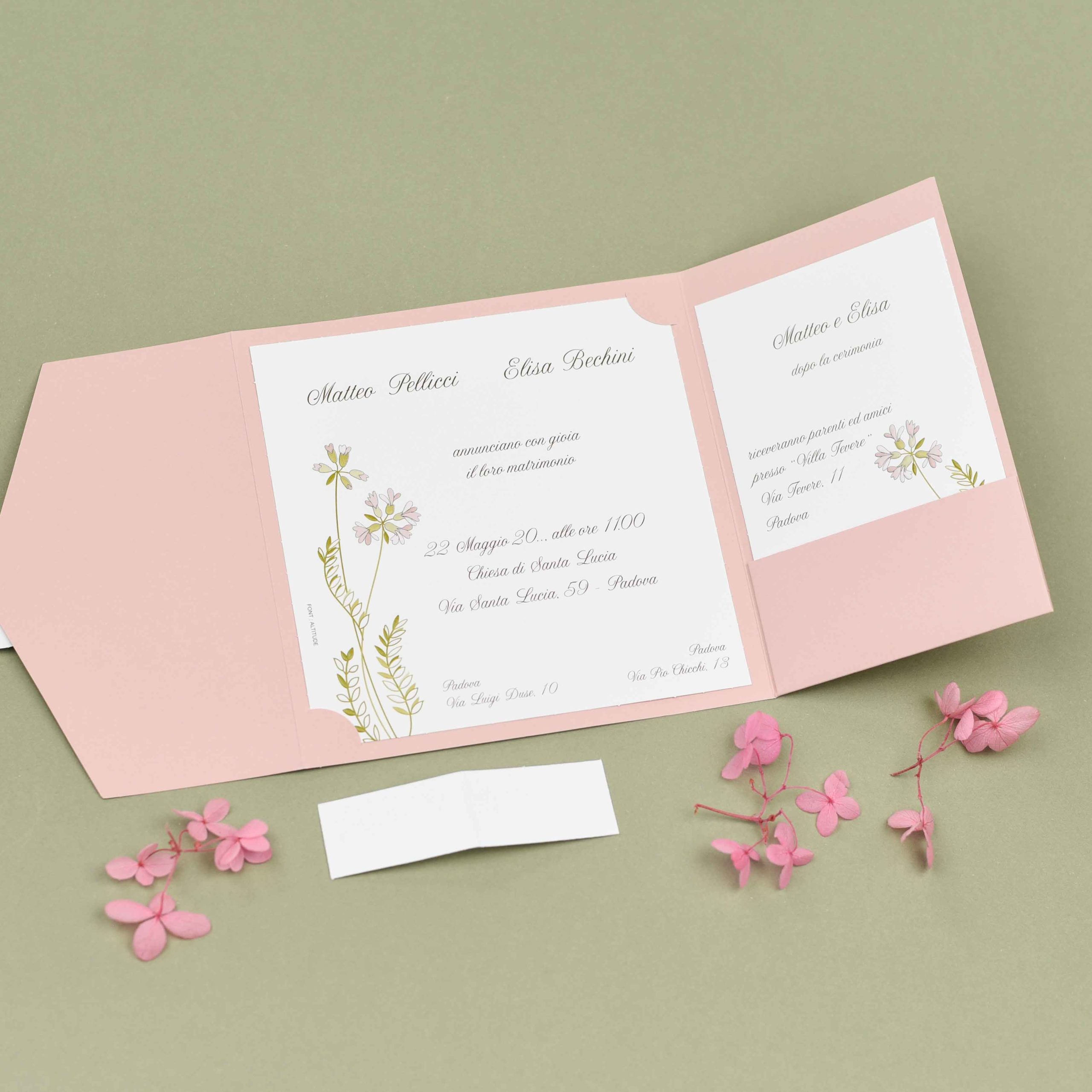 Un fiore verde e rosa si snoda su tutte le varie componenti della partecipazione, associando il biglietto al tema della “Natura”.
