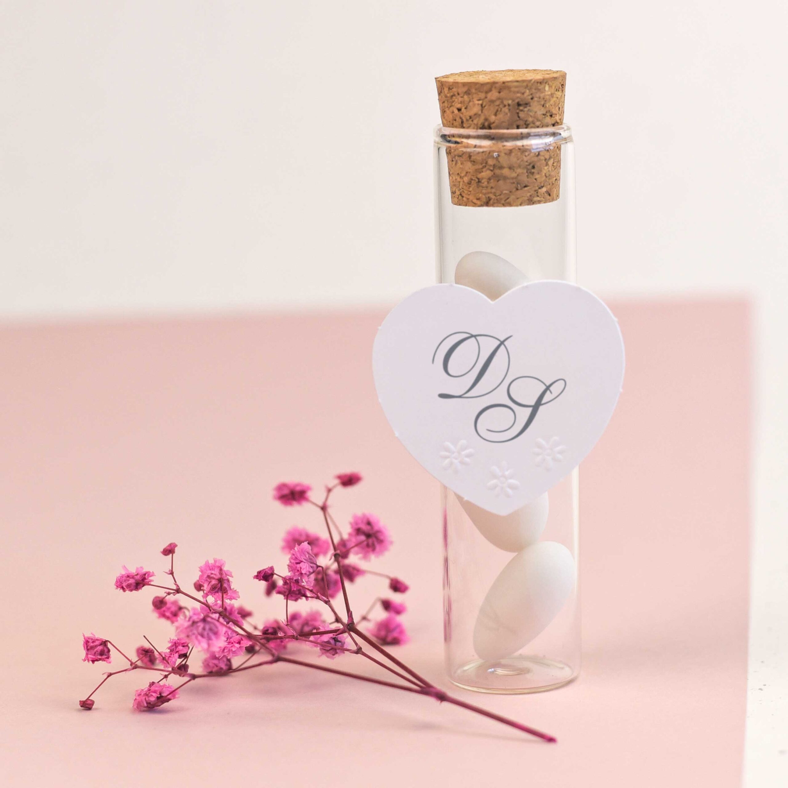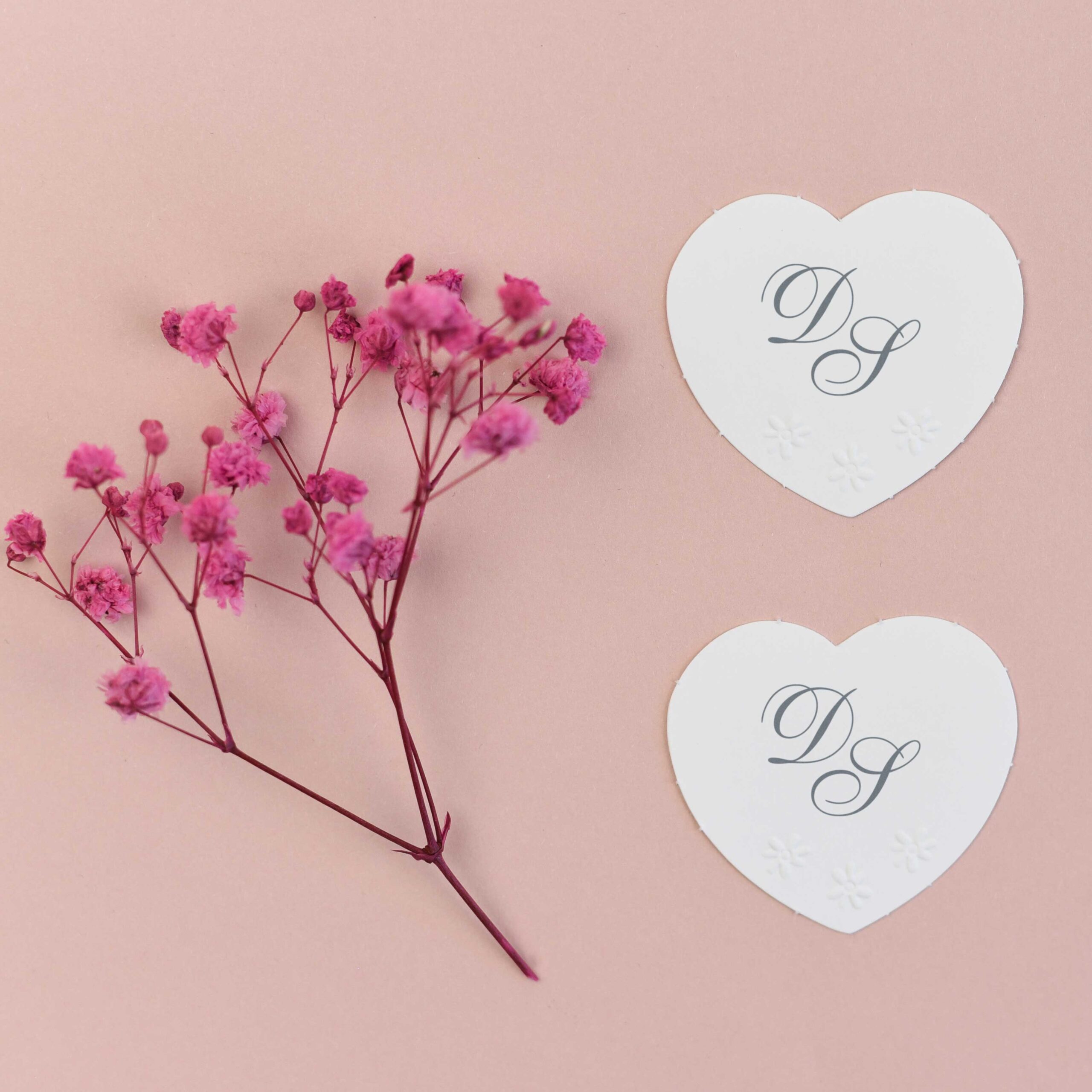 Una piccola etichetta sagomata a forma di Cuore con impresse le iniziali degli sposi con un piccolo foro in alto a scelta per decorare i vostri accessori preferiti tramite un fiocco o un cordoncino abbinato oppure senza foro tramite sottile biadesivo da noi fornito su richiesta . carta Prestige Bianca liscia Bristol 240 gr . decorata con un’elegante stampa a rilievo , consegnata in piccoli blocchi prefustellati a serie di 6 .