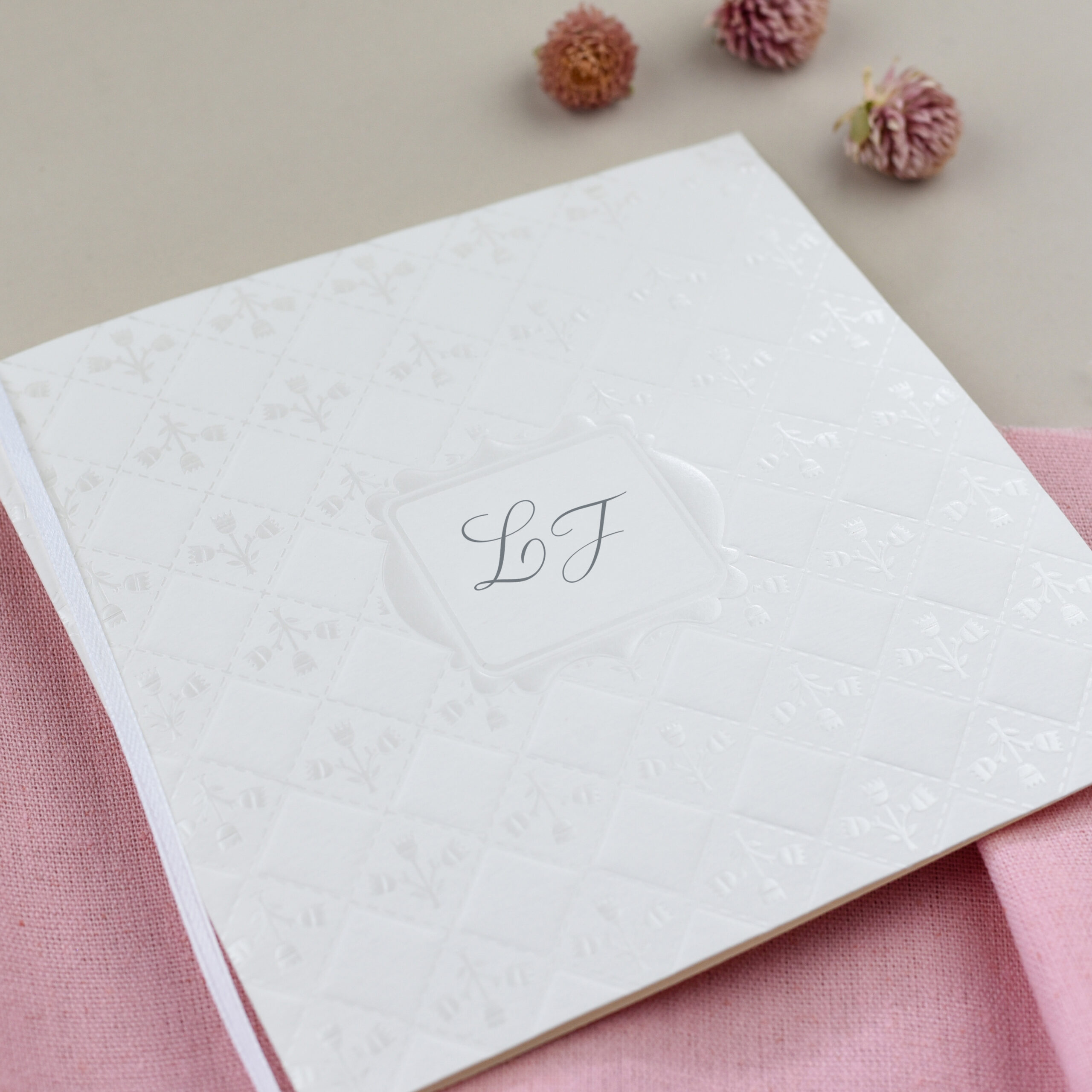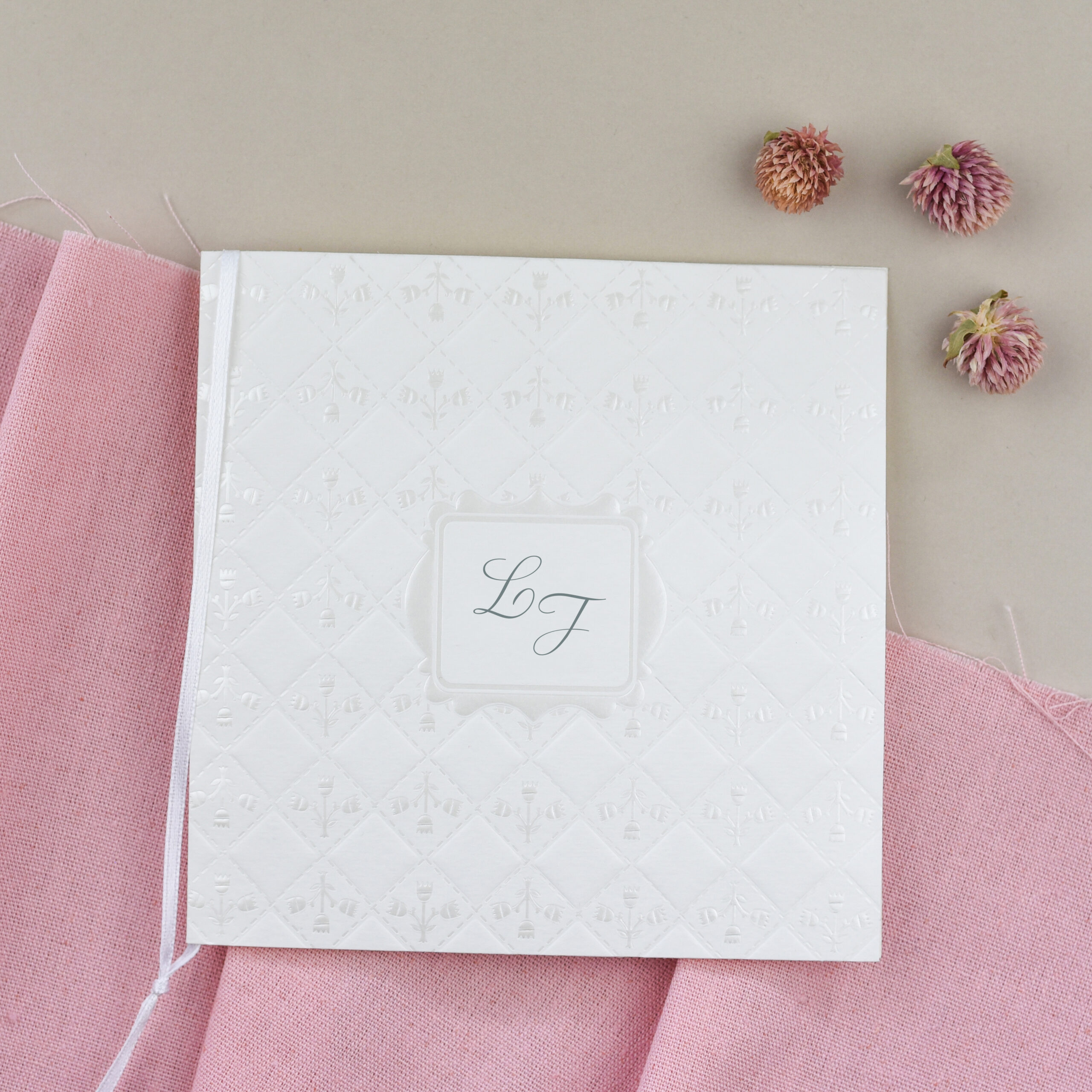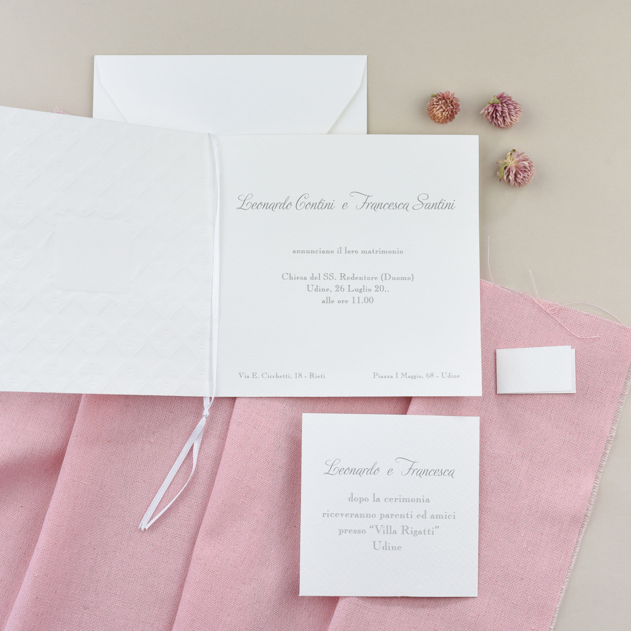 Carta bianco neve 200 gr. per un biglietto decorato con stampa a caldo e rilievo, cinto da un elegante nastrino bianco.