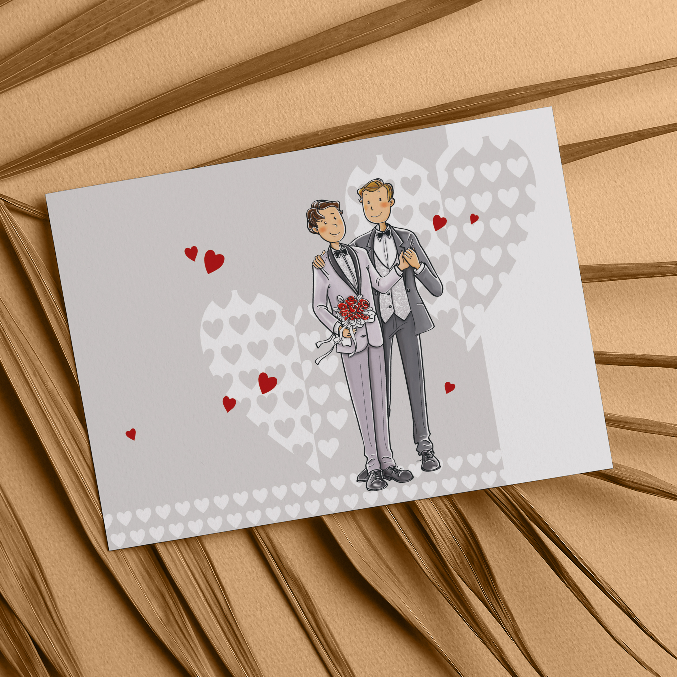 Partecipazione con simpatico disegno umoristico stampato su pregiato supporto cartaceo bianco goffrato Natural Evolution White 200 gr.