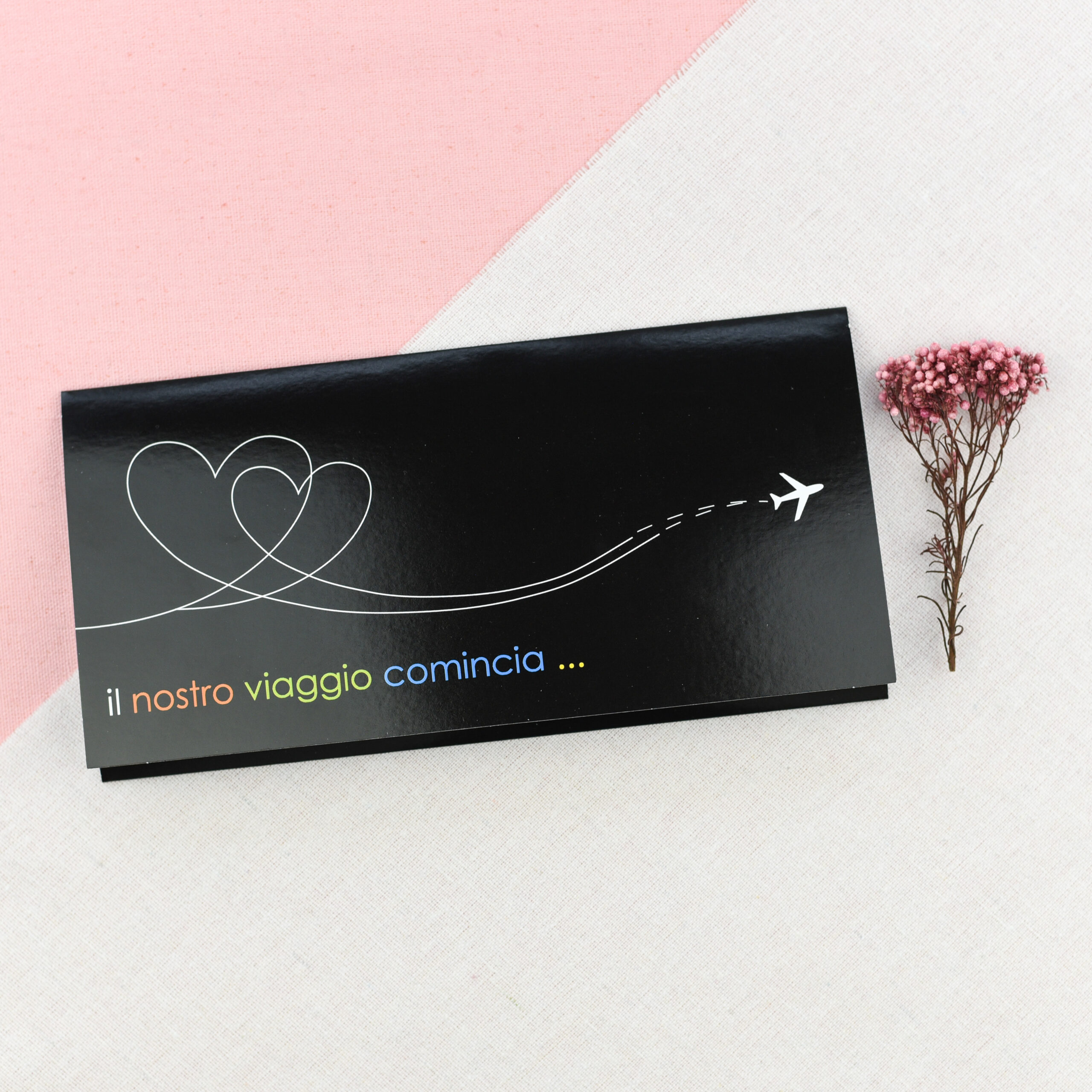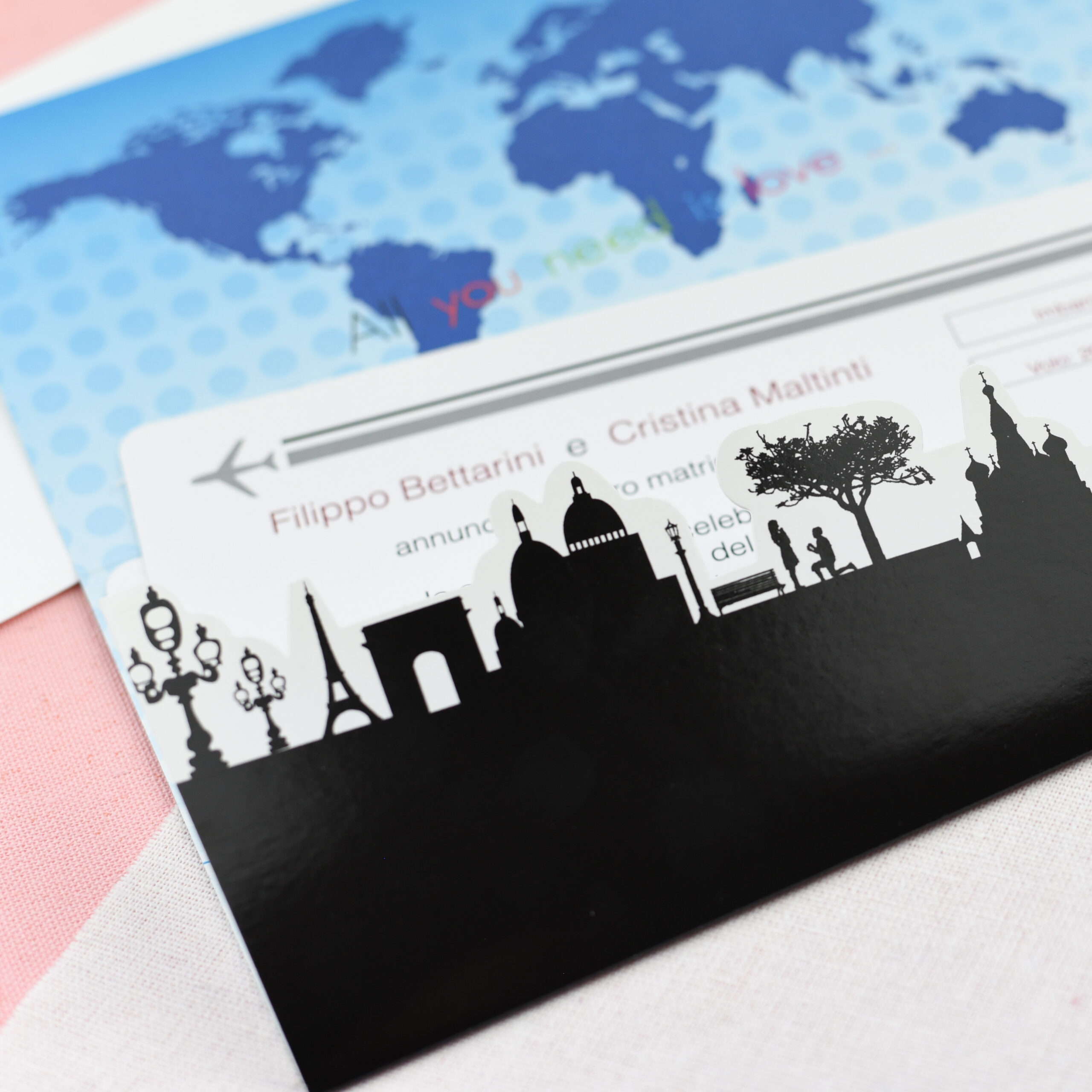 Partecipazione formato biglietto aereo su carta bianca patinata 250 gr. con inserto a colori e vernice lucida.