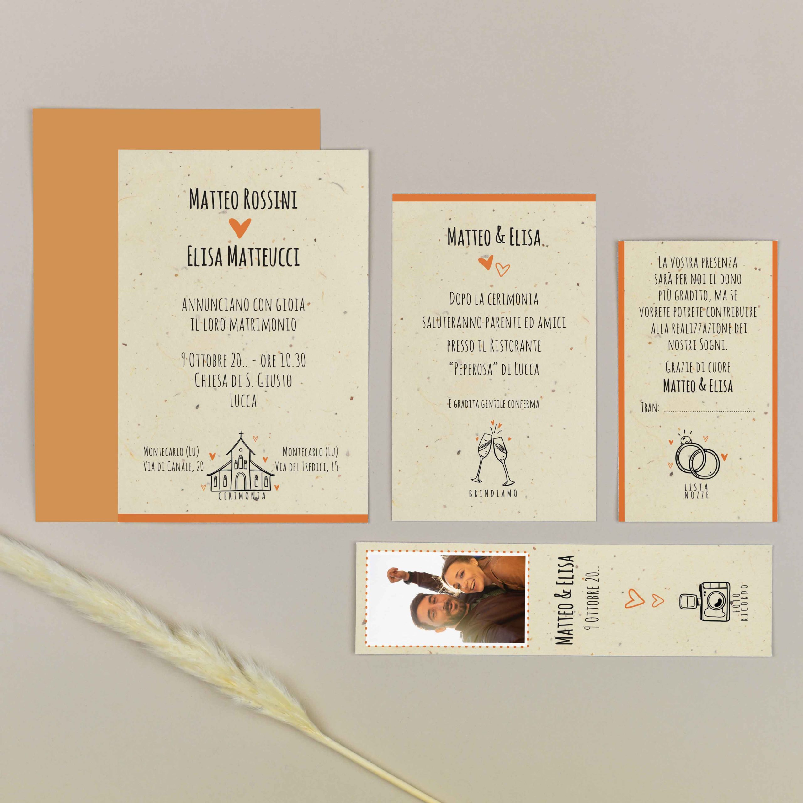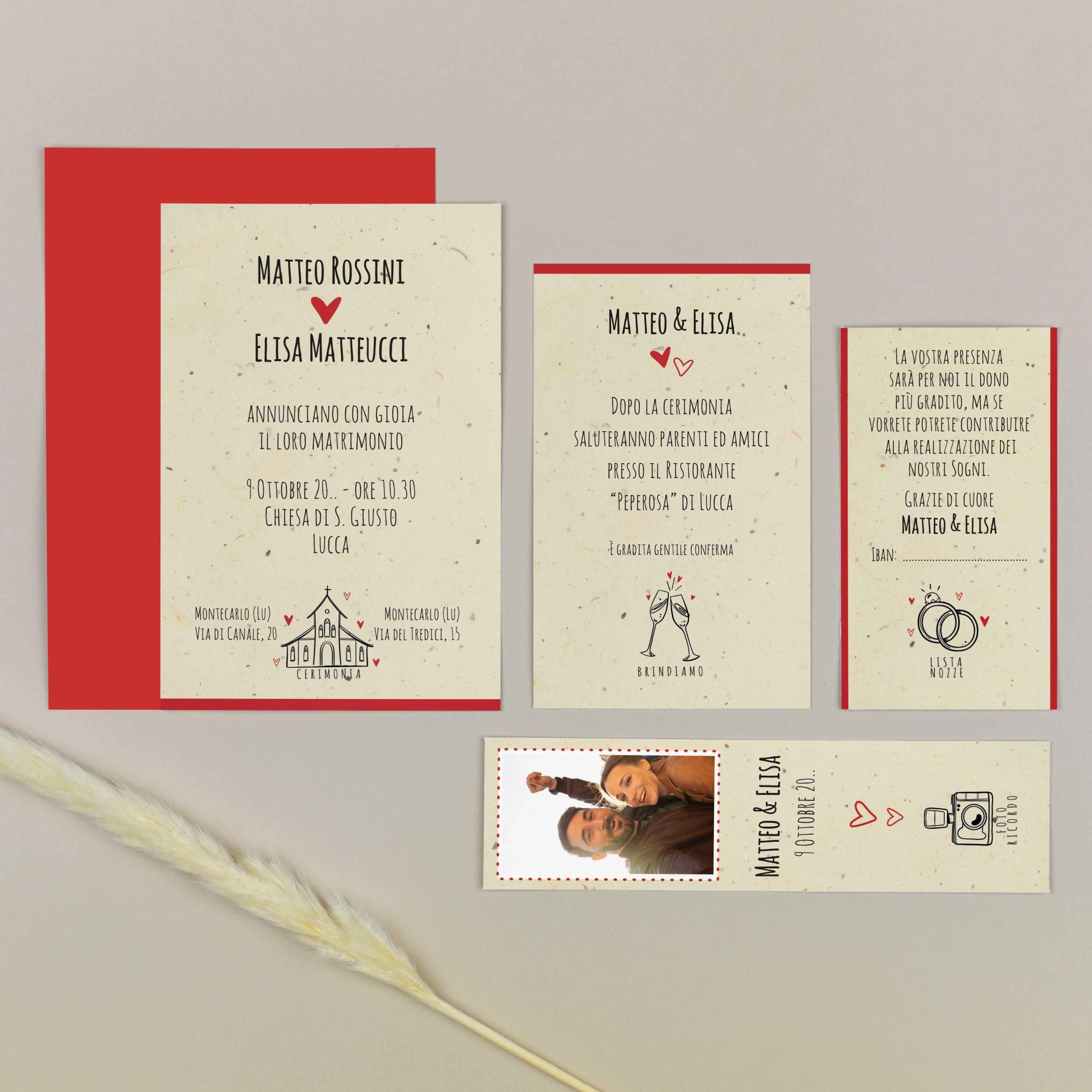 Kit matrimonio peperoncino, stampato su cartoncino bianco ma con una texture sullo sfondo per simulare la carta Flora.