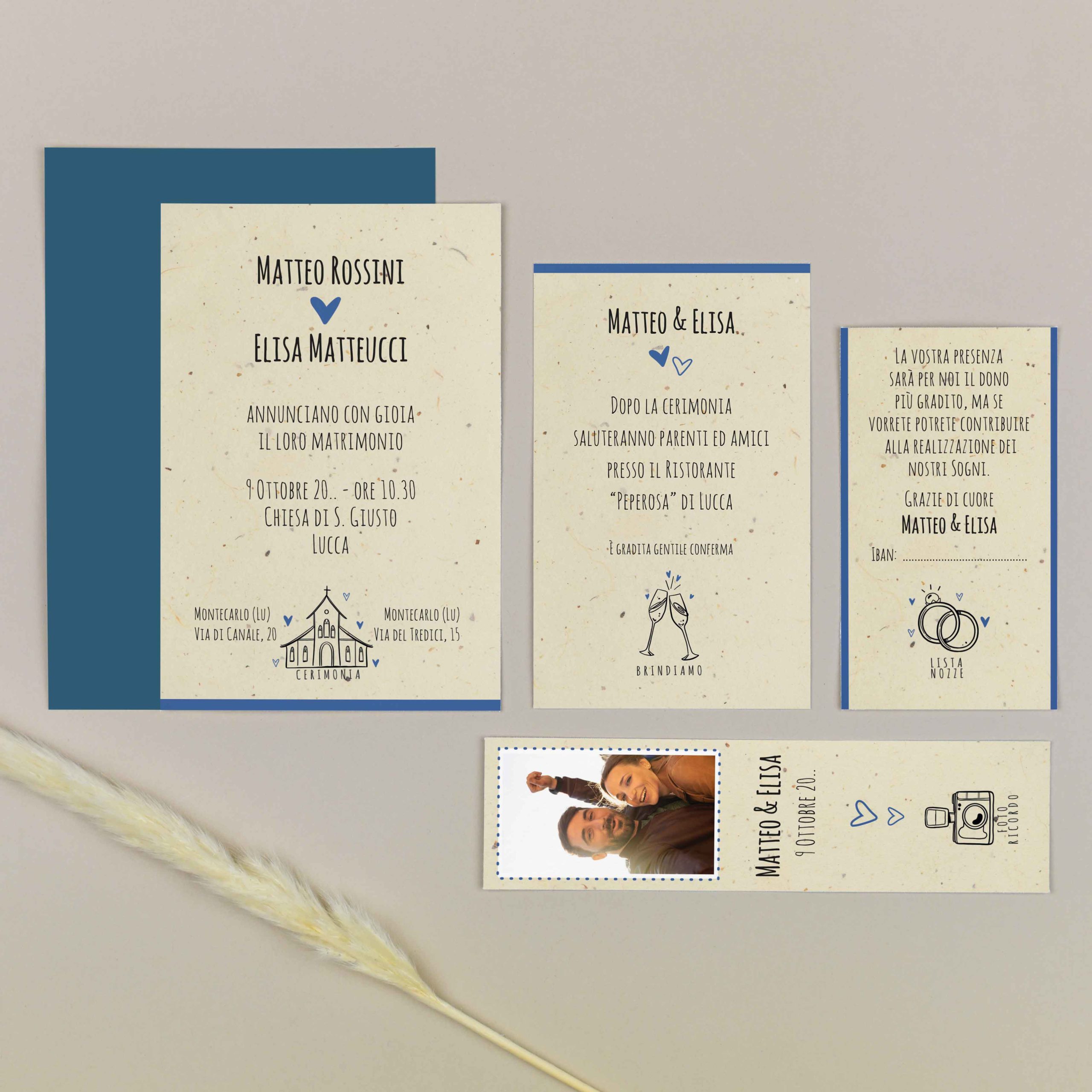 Questo kit comprende partecipazione, invito al ristorante, biglietto IBAN/ringraziamento, cartoncino ricordo.
