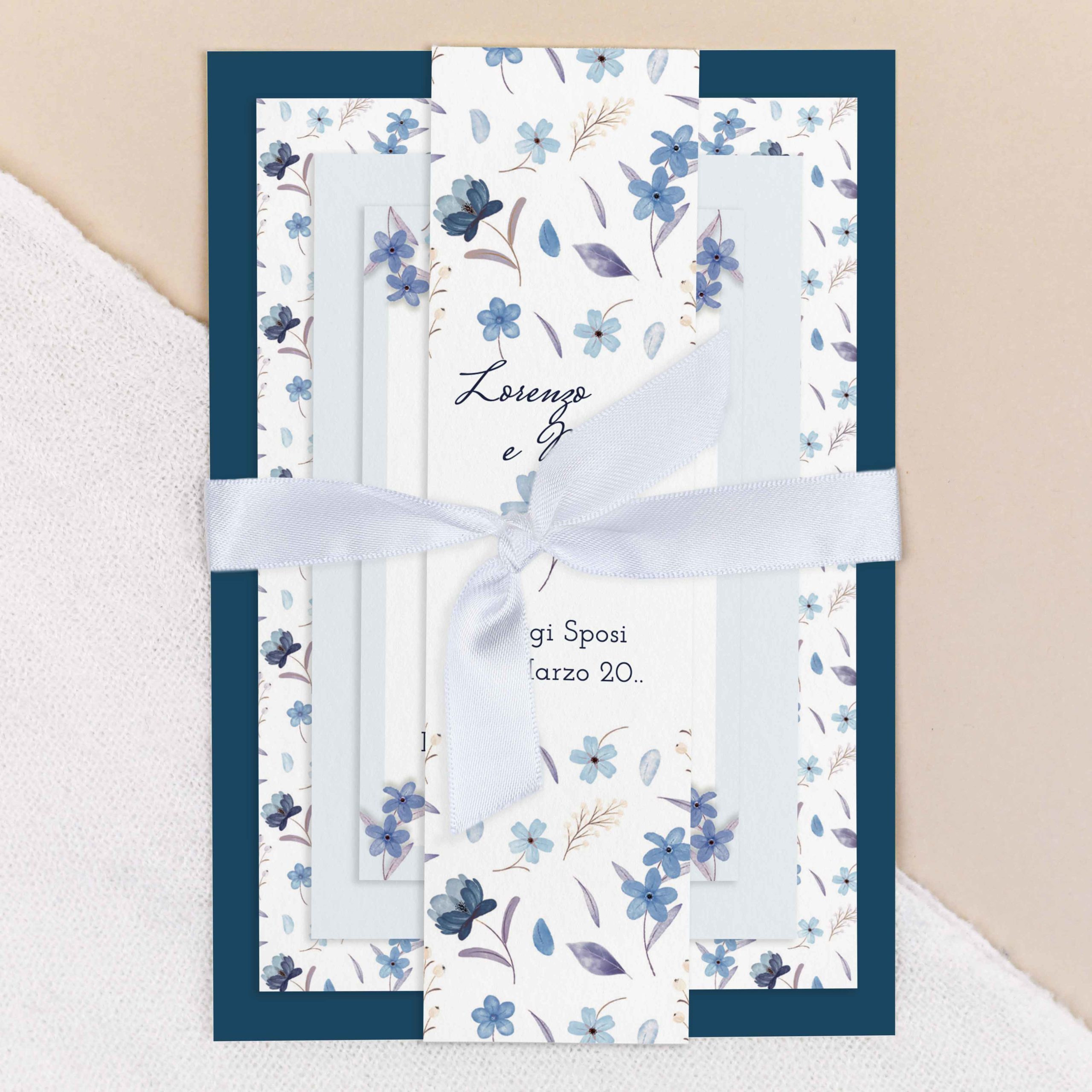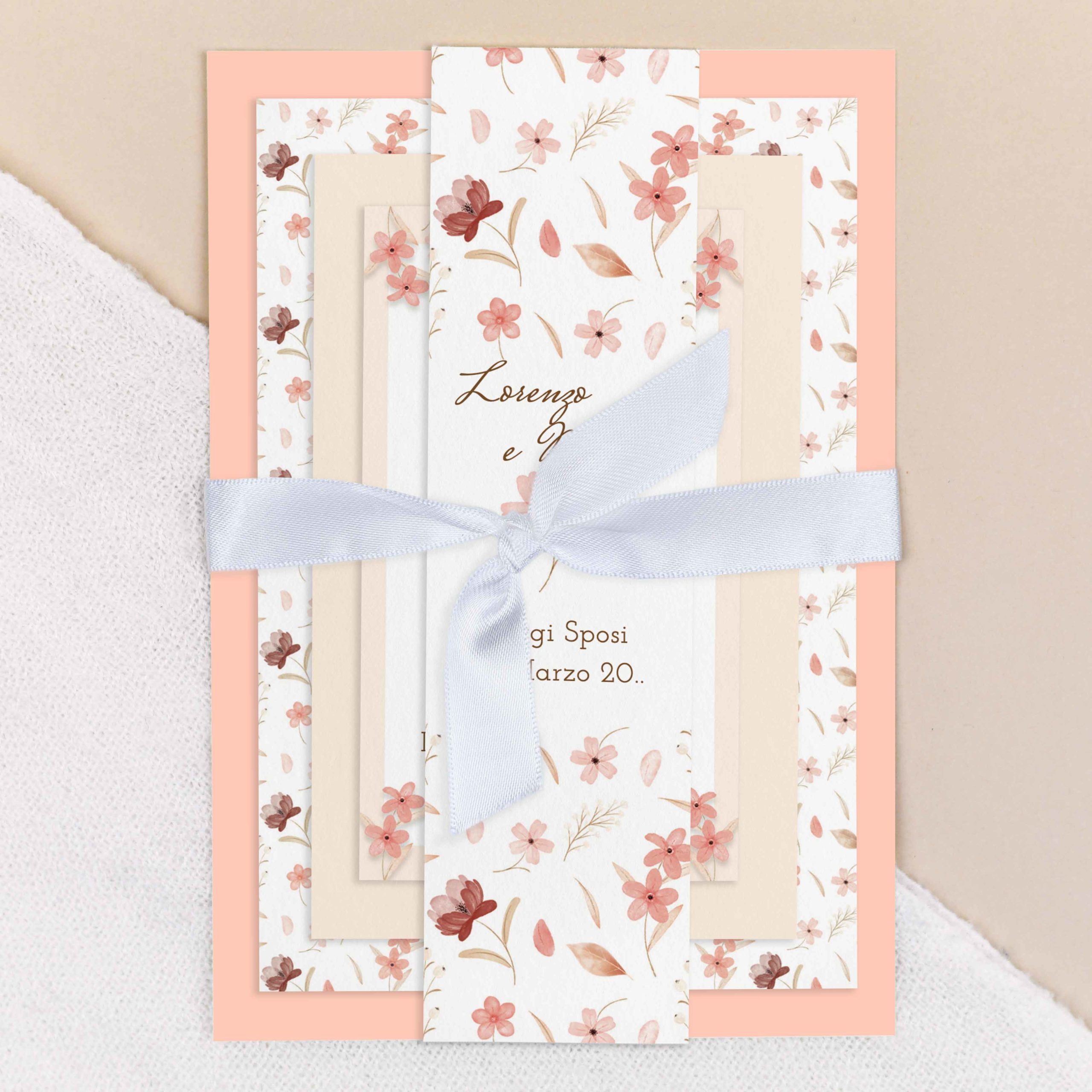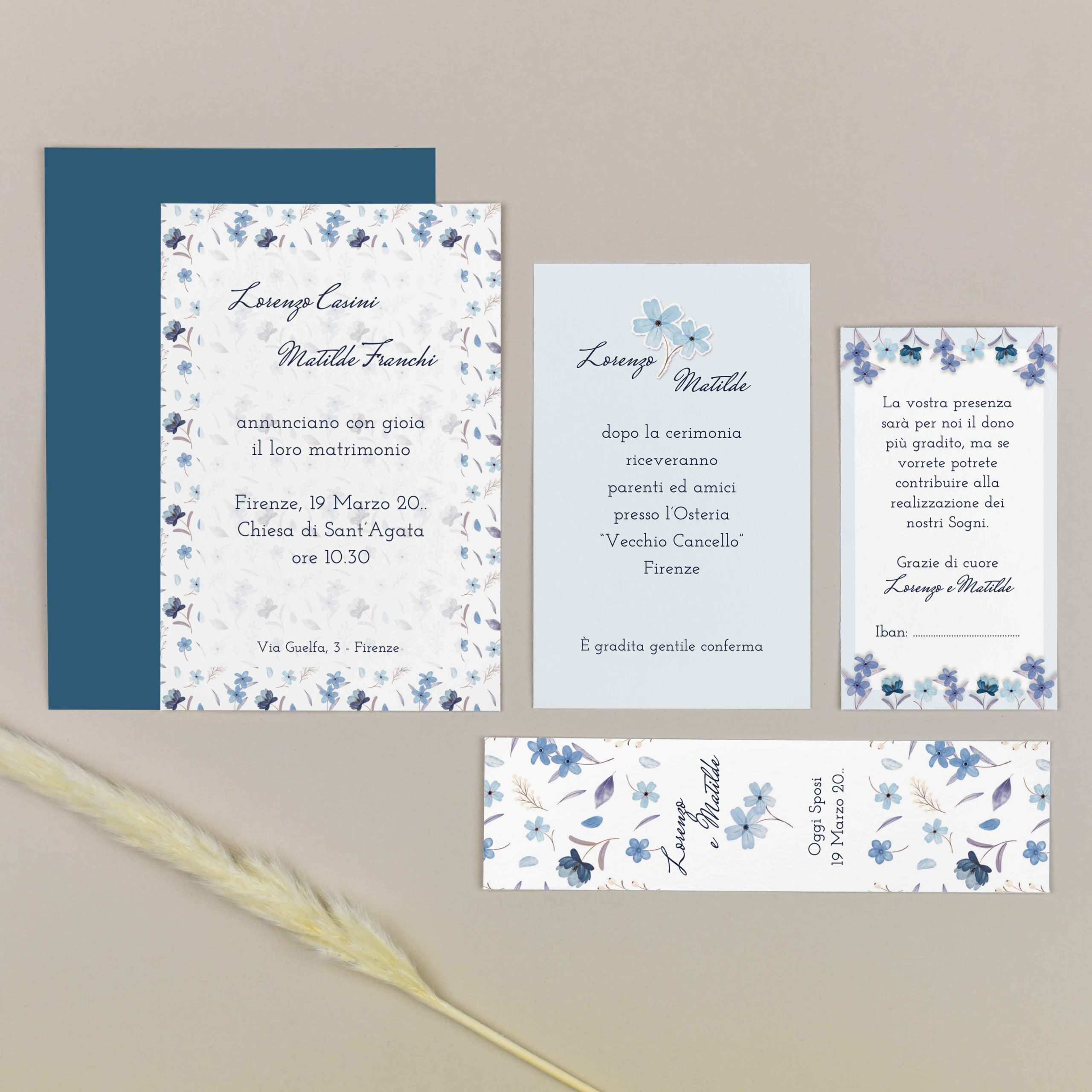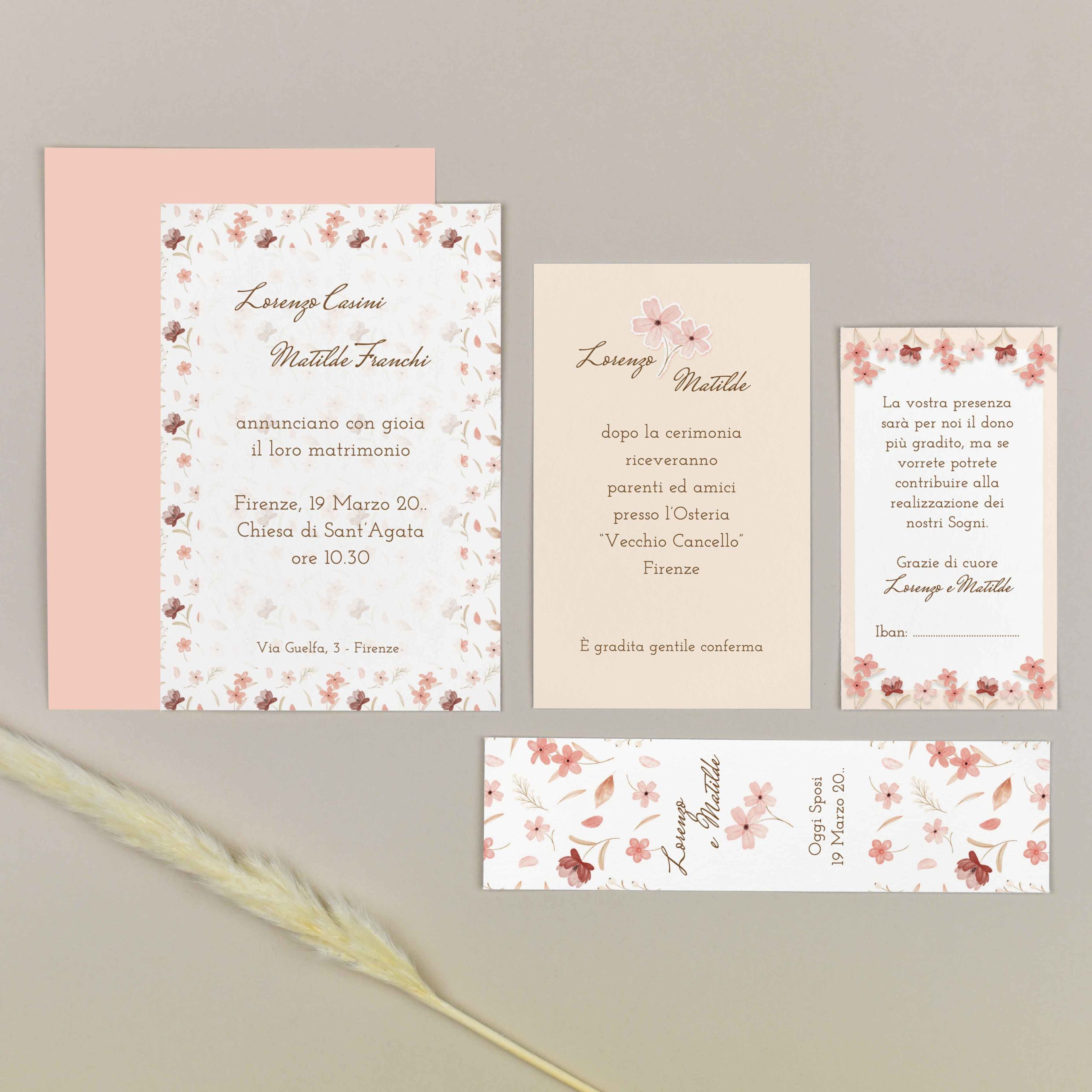 Kit matrimonio floreale composto da 4 biglietti e un cartoncino colorato decorativo.