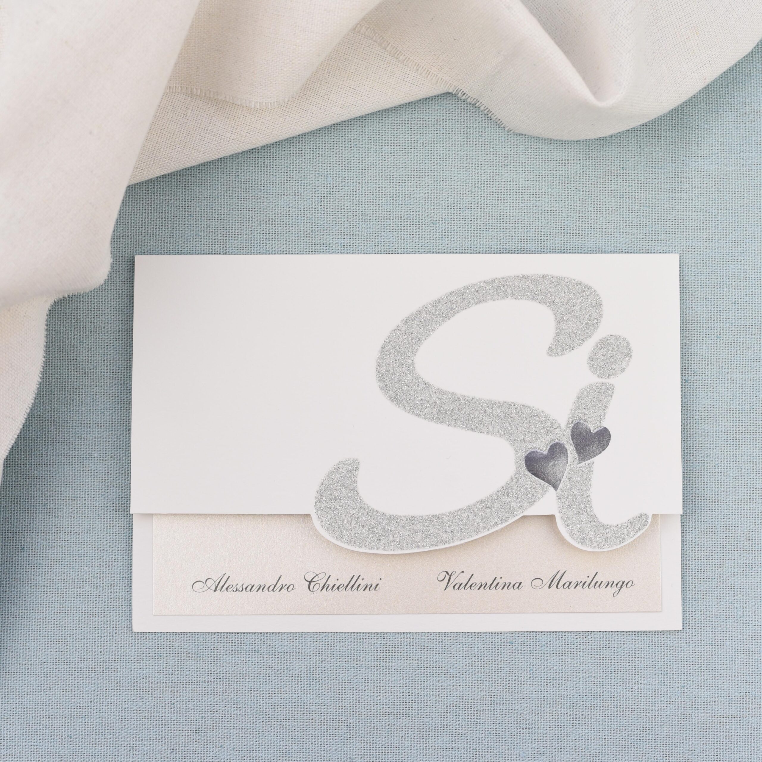 Partecipazione semplice su carta natural evolution 200 gr , sagomata , stampata in argento a caldo e glitter argentato . inserto in carta metallizzata.