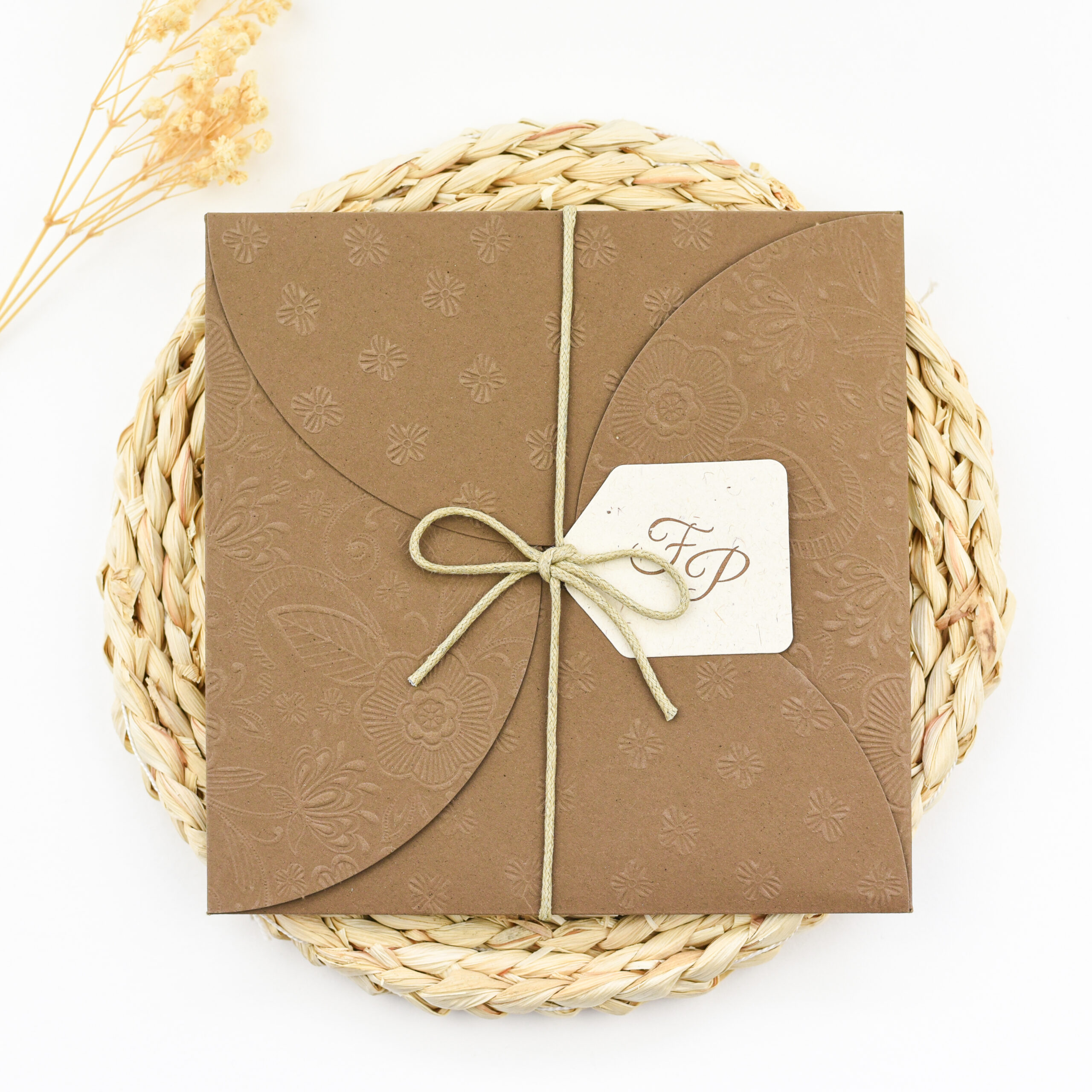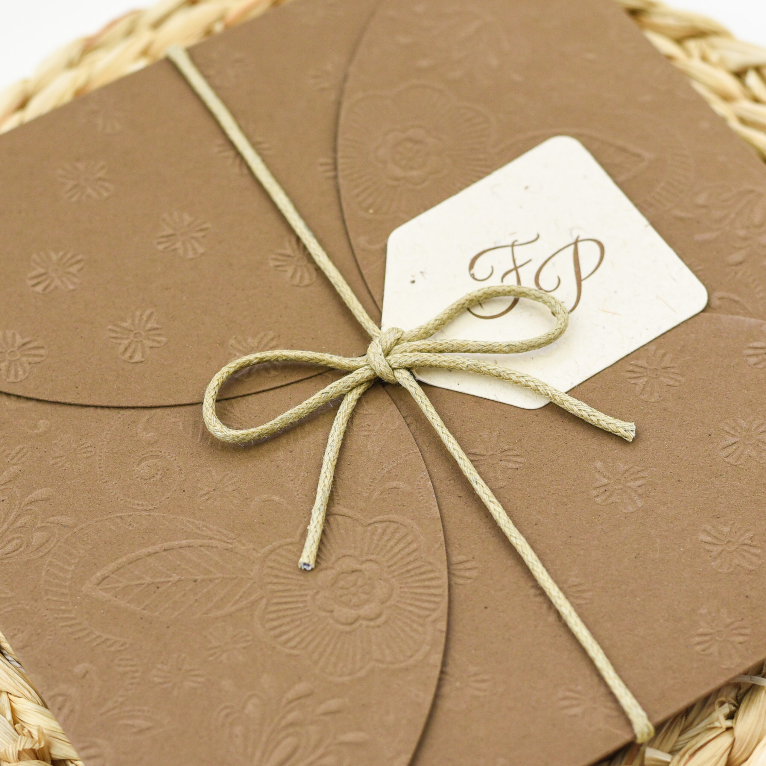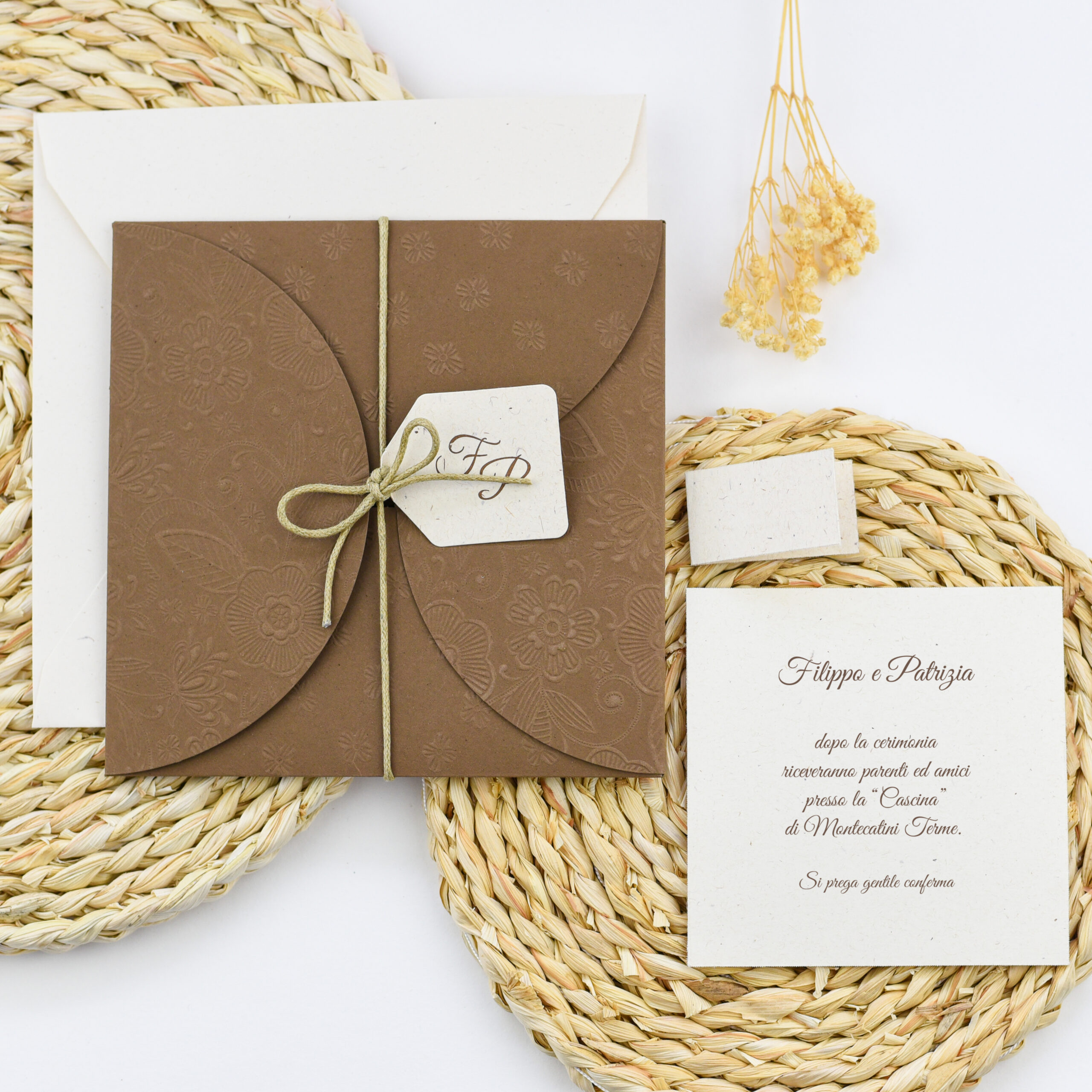 Nocciola è una partecipazione di nozze composta da una tasca esterna marrone, decorata da fiori in rilievo, e da un cartoncino in flora con i dati degli sposi.