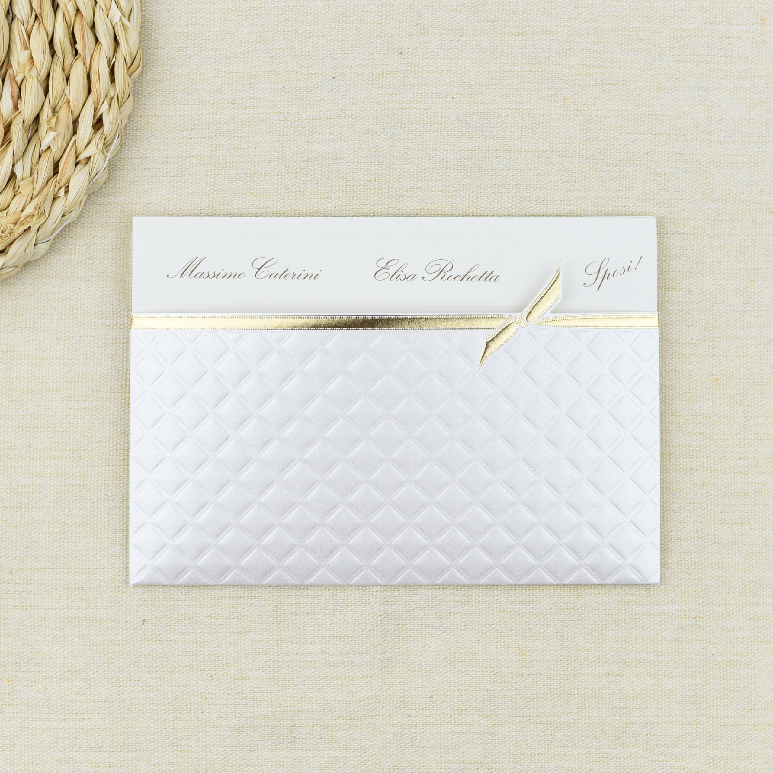 Partecipazione a tasca in quarzo 250 gr. con oro a caldo e rilievo, all’interno un cartoncino avorio con cornice a secco.
