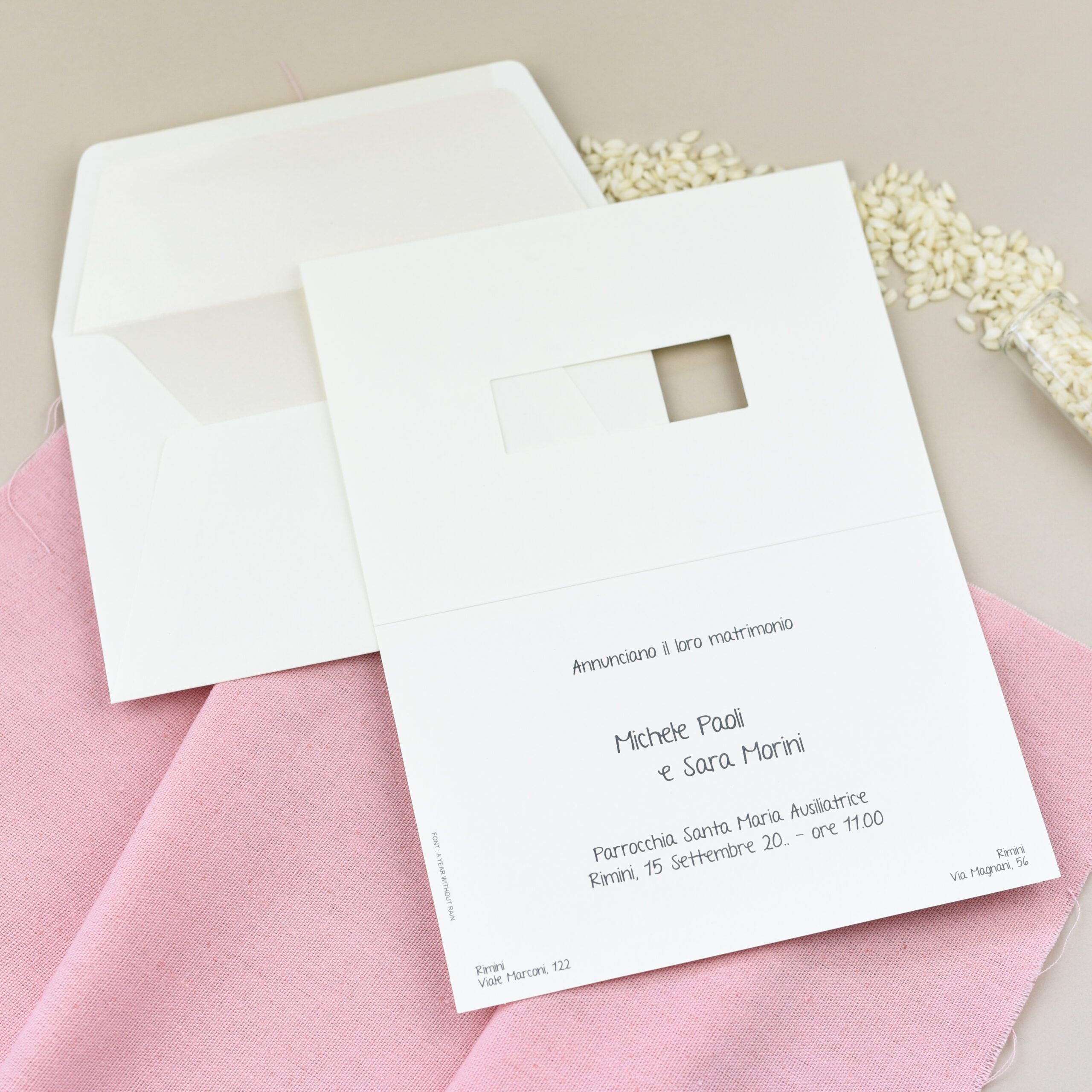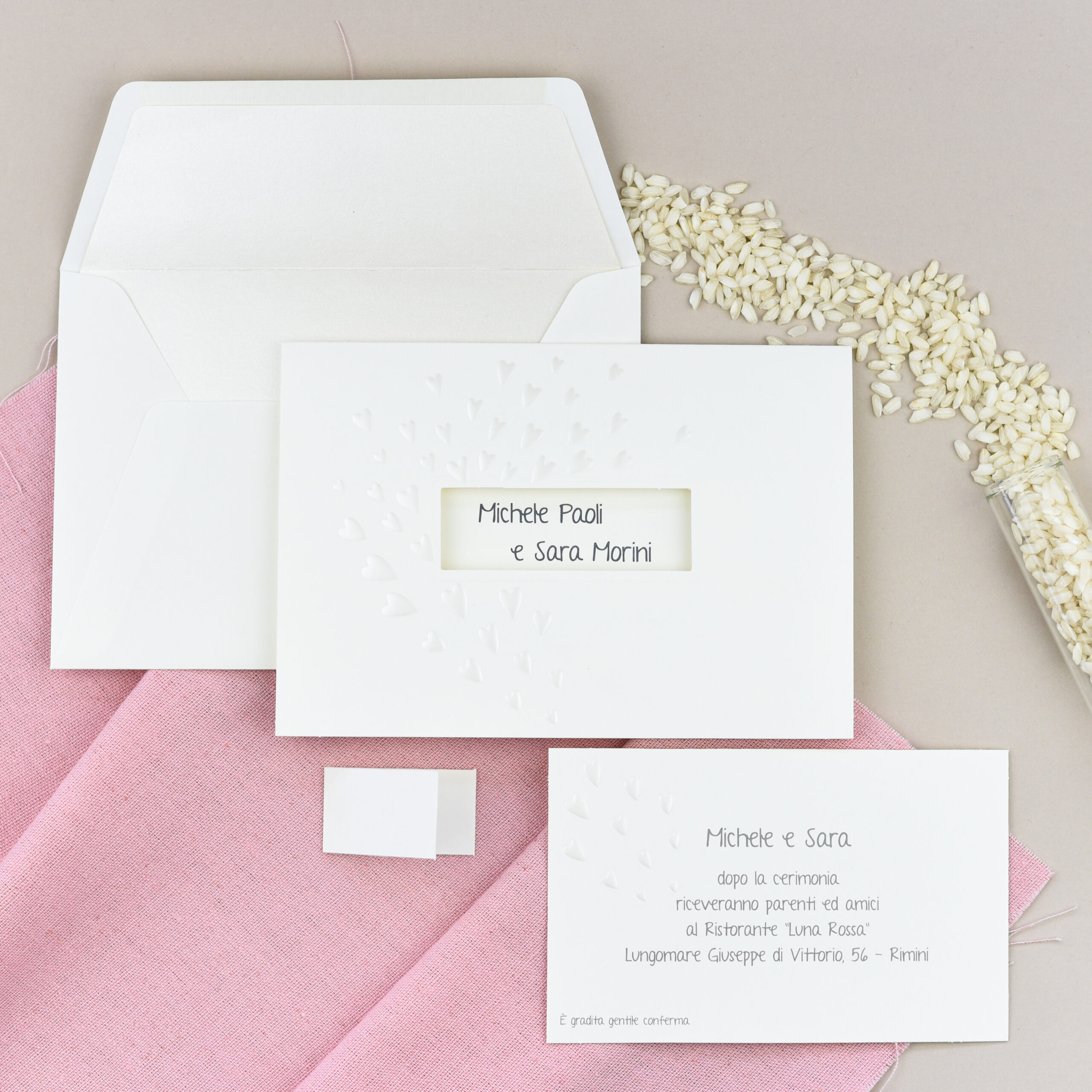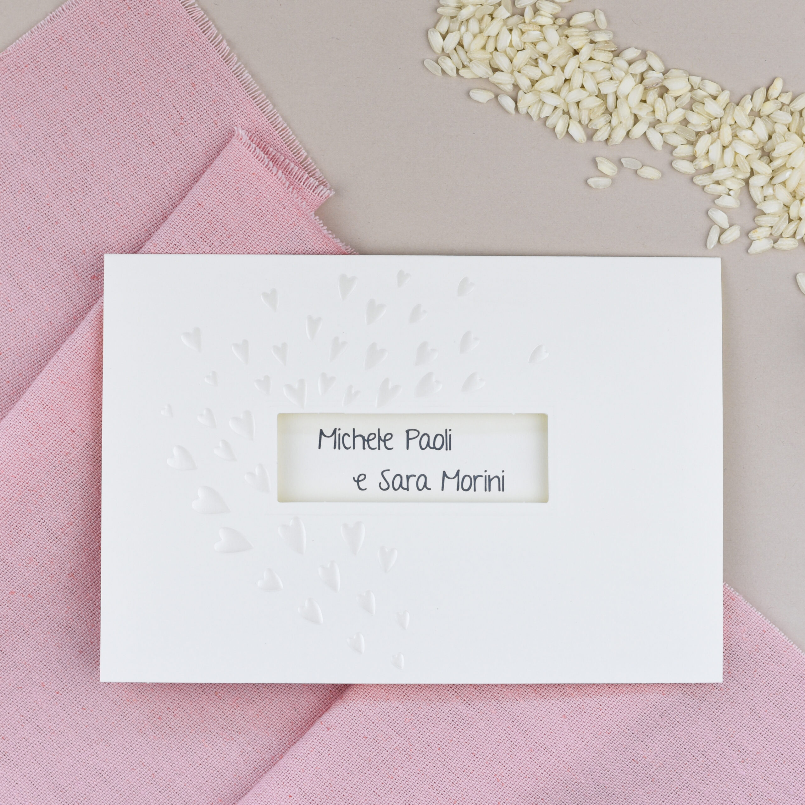 Partecipazione di matrimonio su cartoncino avorio, con cuoricini in perla a caldo stampati in copertina.