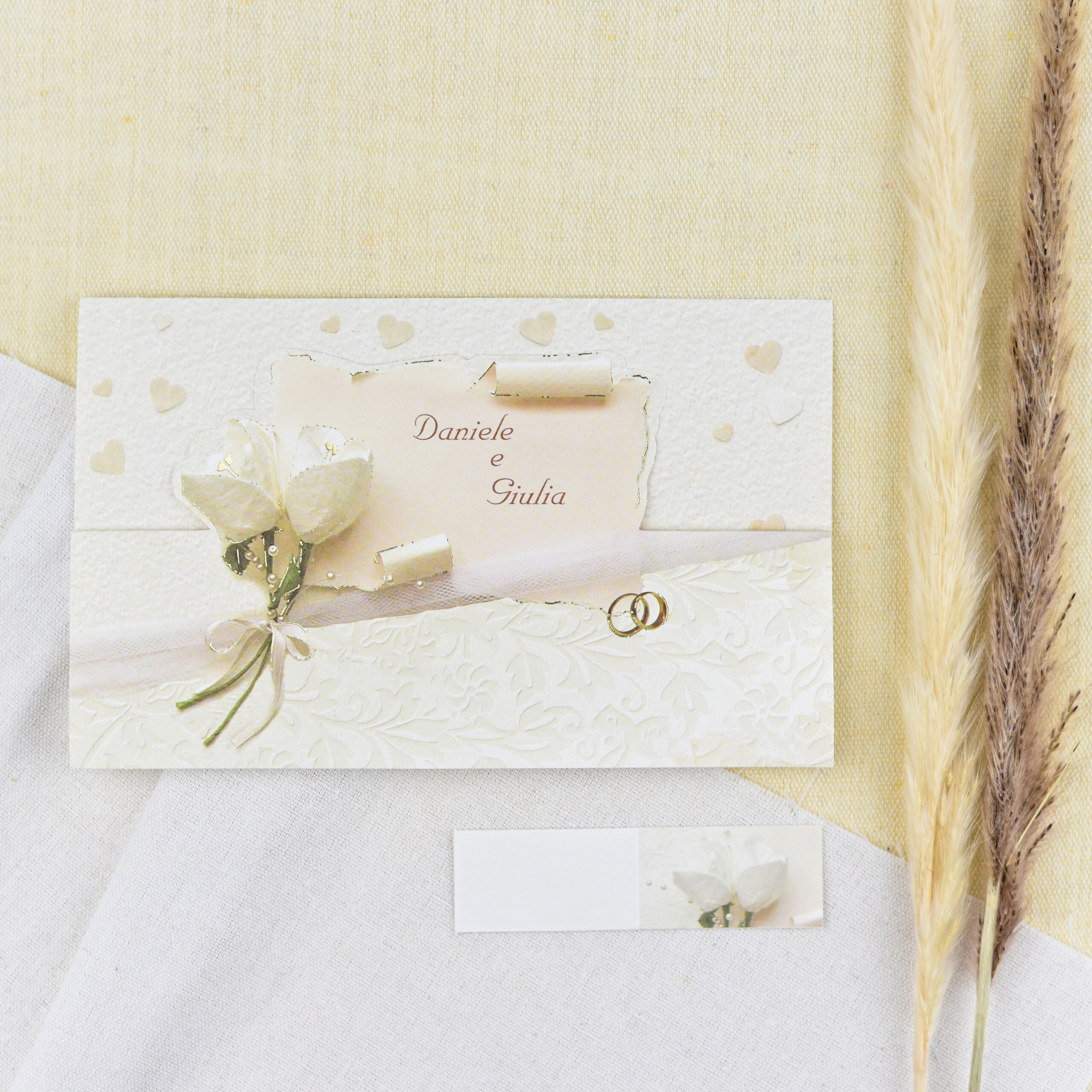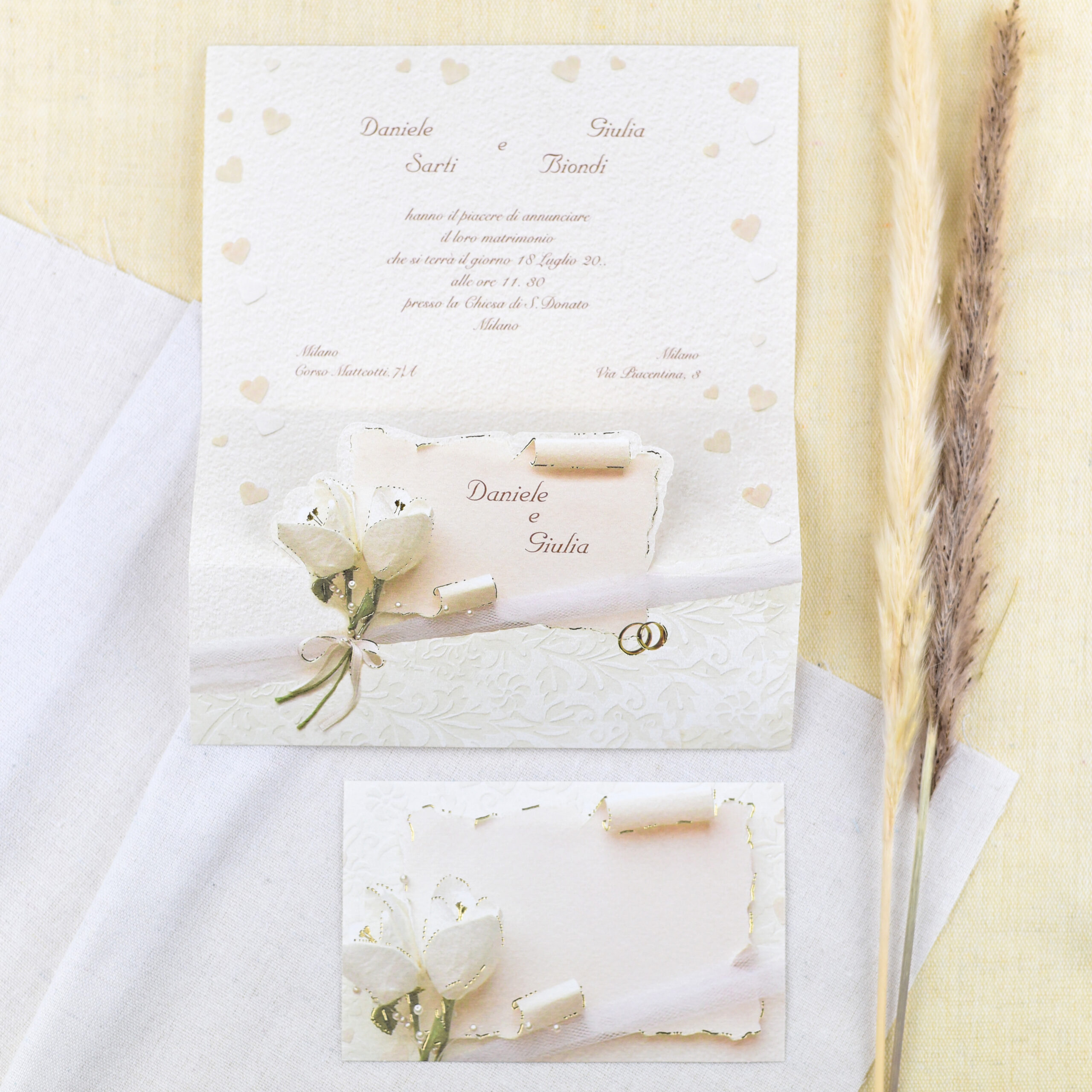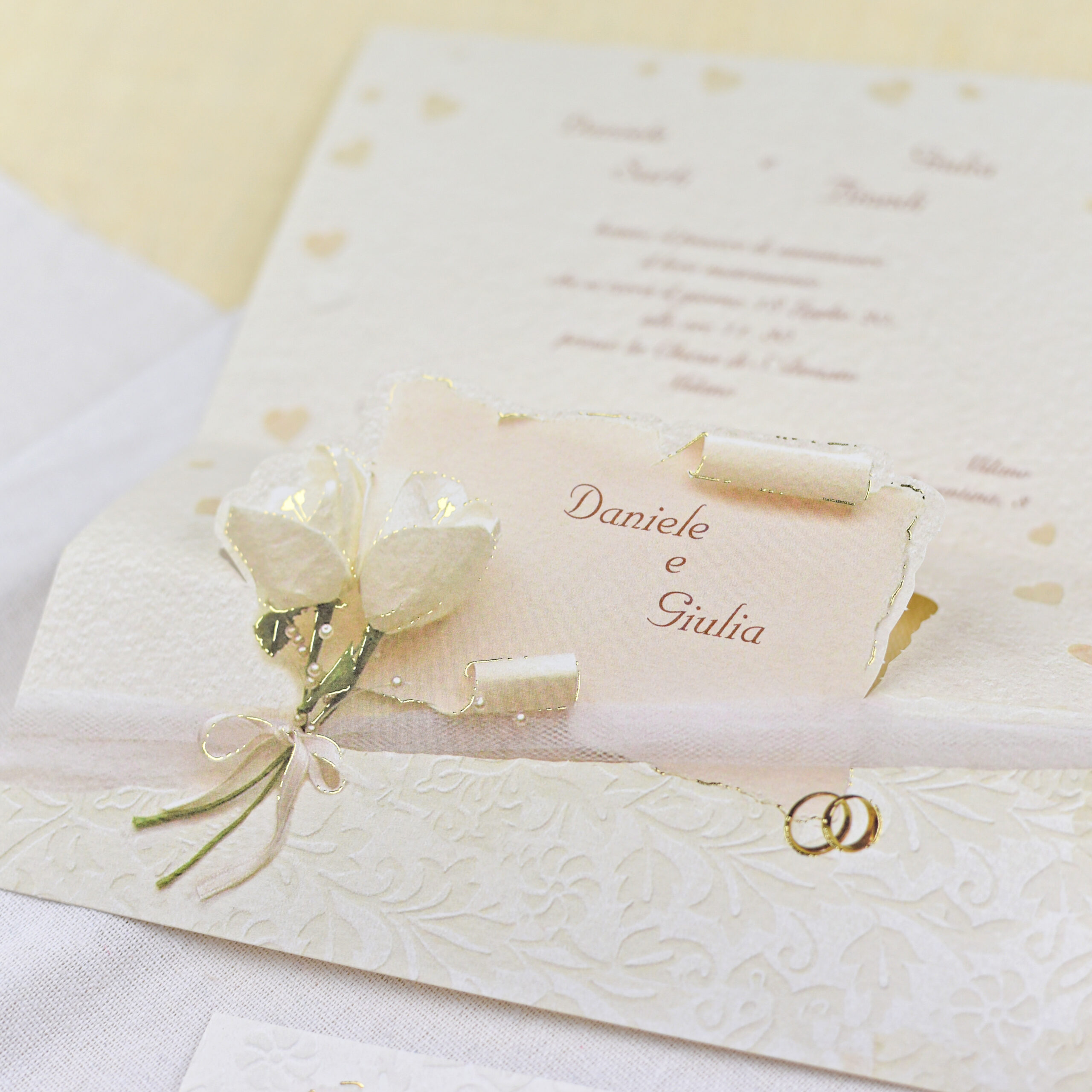 Partecipazione su carta bianca goffrata 200 gr decorata in oro a caldo.