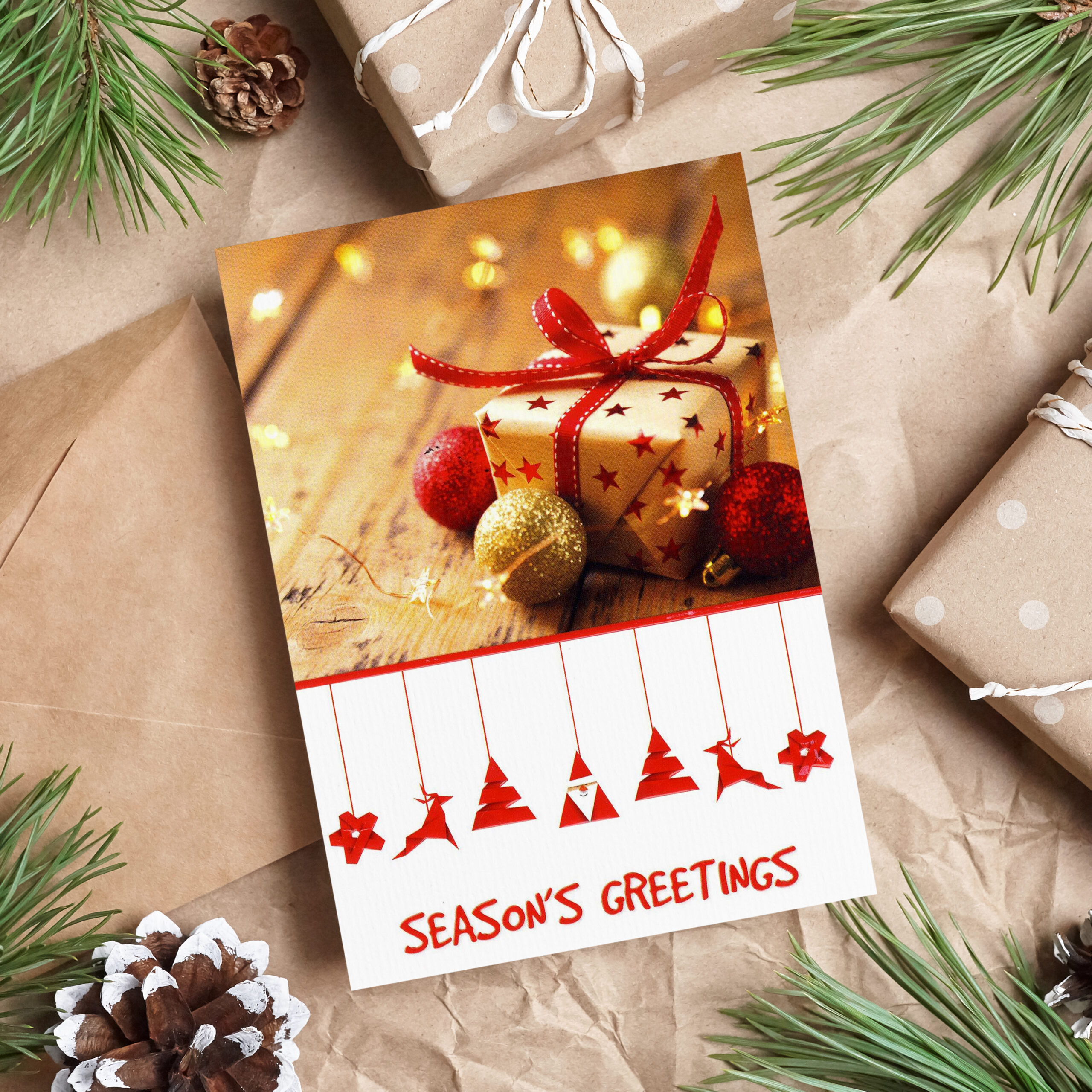 Biglietto di Natale in cartoncino bianco con stampa a colori e vernice lucida. Decorazioni in rilievo.