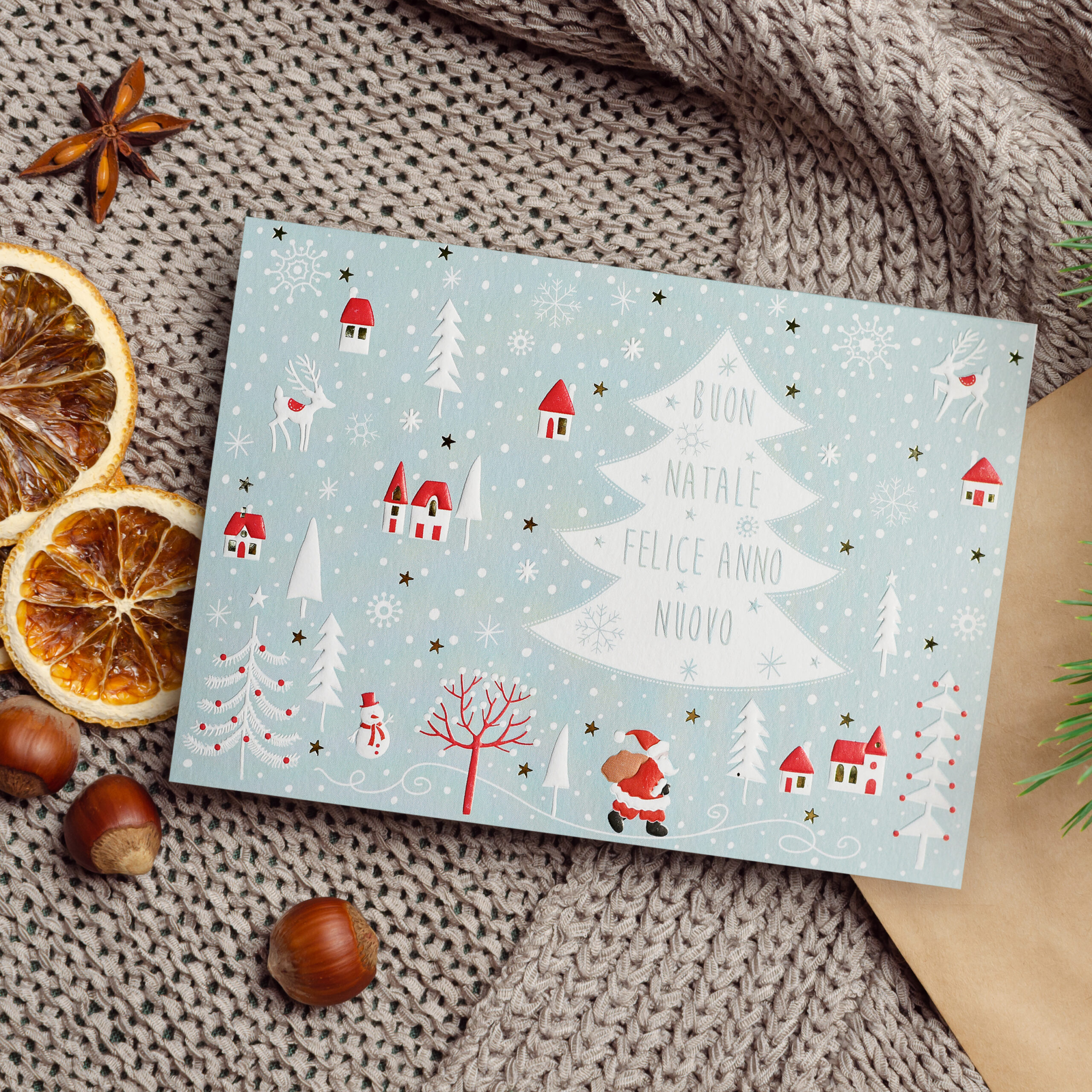 Biglietto di Natale in cartoncino bianco con stampa a colori e decorazioni in oro a caldo e rilievo.